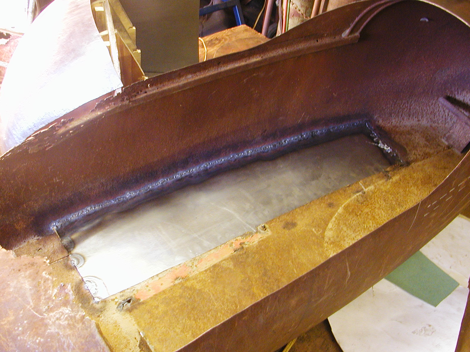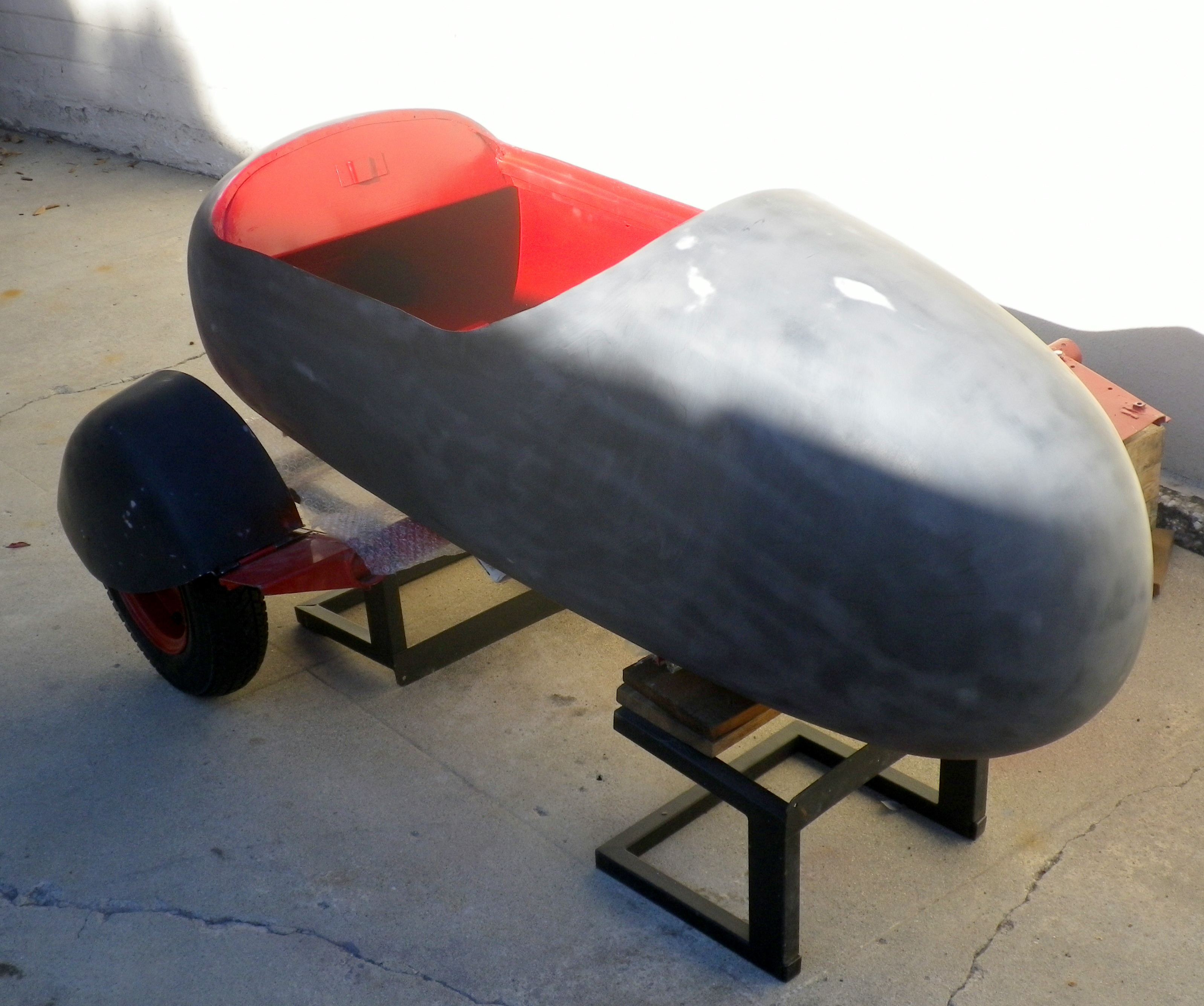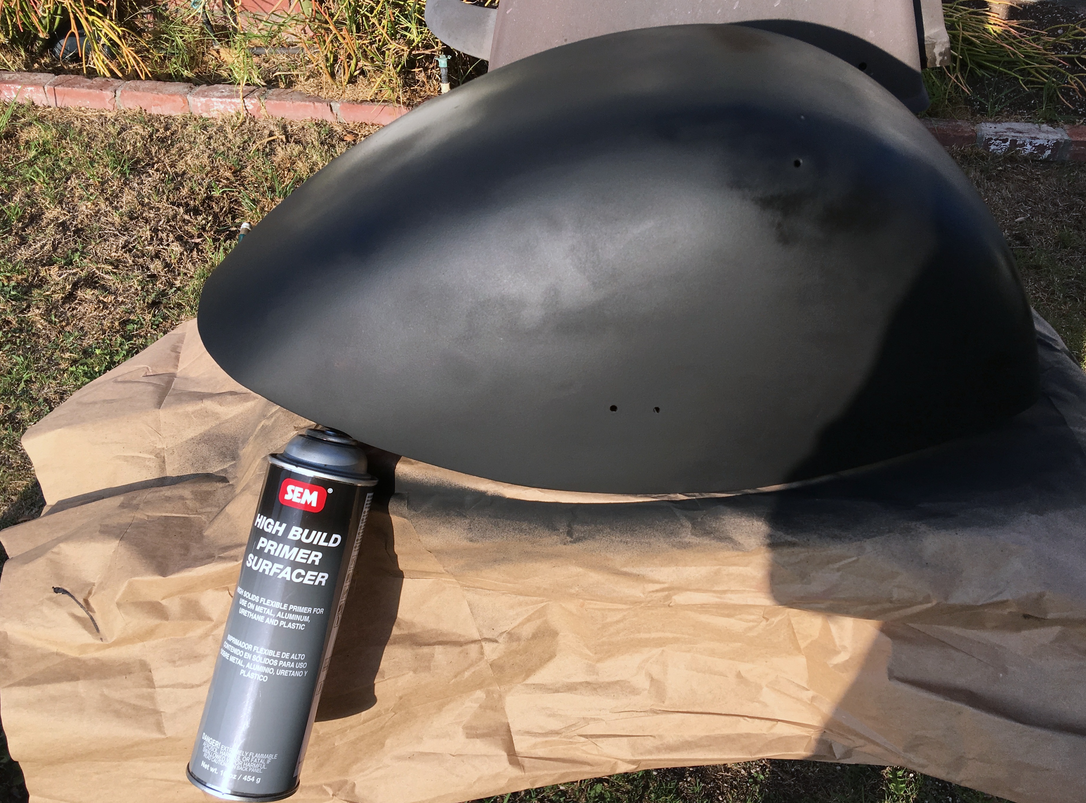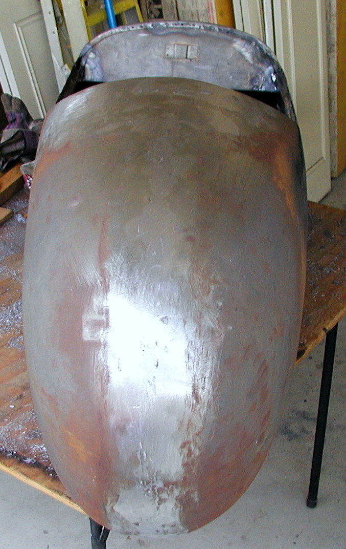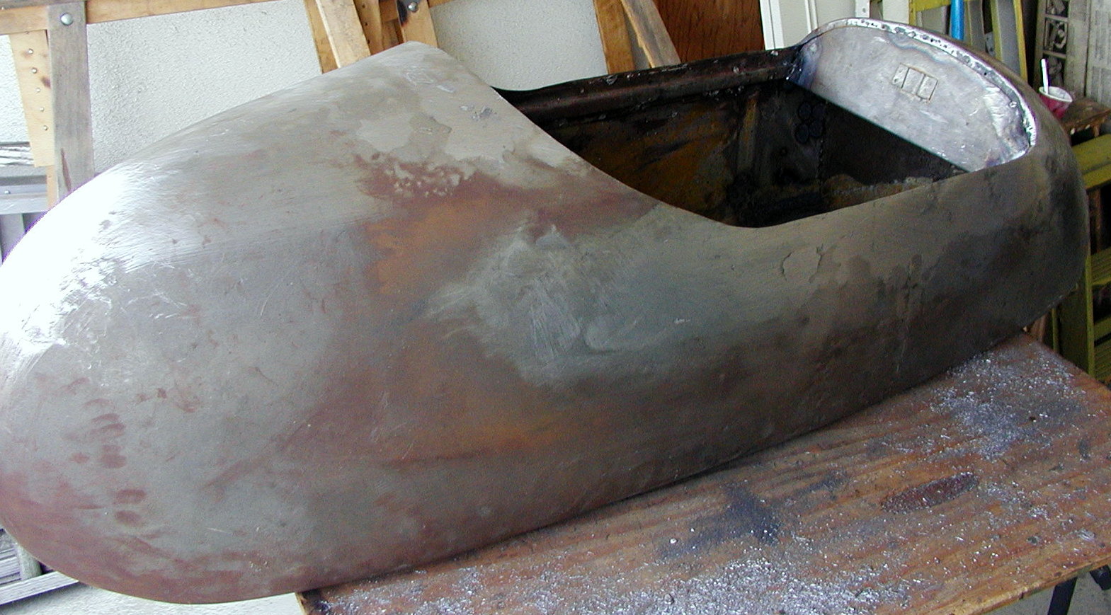 January 26 update from Tim: "I did not put a lot of time on the sidecar this week, but it is coming together nicely. I trimmed the new pieces that I made and skip welded them on. Still have to do a solid weld and then hammer them out smooth, then the tail end will be finished, Then on to other smaller parts of the body." February 1, 2018 - approximately 90% complete! Great work by Tim! After many years of waiting for the sidecar, the end is in sight! Next stop - rust removal by L&M Stripping! As delivered on February 22 to L & M Stripping with its fender: After chemical de-rusting by L & M Stripping on February 27; then picked up by Tim Todd: The fender - after more work by Tim. Ready to be primed on March 29! The fender after one coat of Rust-Oleum auto primer, April 7 April 28, 2018, from Tim: "Have been working hard on the sidecar. I finished up the welding on the tail end and the floor. The floor is giving me a lot of problems. Can't get it very smooth. Trying to blend the new metal with the old is giving me a huge headache. I leaded over the rust holes on the left side and have it mostly filed out. I still have to add the extra support metal for the body bolt holes and a piece on the floor for the seat. Having a lot of trouble smoothing the body out. The old metal must have hardened with age and acid washing. Next week when I get all the parts attached, I will bring it over to you to look at and you can tell me how far you want me to go to try and smooth it out." The sidecar was delivered by Tim Todd on May 8, 2018; ready for priming and painting: In Burbank, May 8, 2018 May 10-12, 2018 - The sidecar interior was treated with "Fast-Etch" to prepare for prime coats. The first light prime coat went on the interior on May 12. Also, the sidecar axle threads were repaired by expert restorer and friend Jerry Miscevich. The new Timken bearings that came with the sidecar wheel (from Dan or Lake Havasu?) are not compatible with the partially threaded 3/4"axle. Bearing cups/races Timken #09195 have been pressed into the wheel, but replacements are needed for cones/bearings #09076 to fit the axle - to be purchased soon! Matching automotive color coat paint will also be acquired - red, of course! May 13, 2018 - Rust-Oleum automotive primer was used for the first prime coat; all of the interior and exterior is done except the bottom: