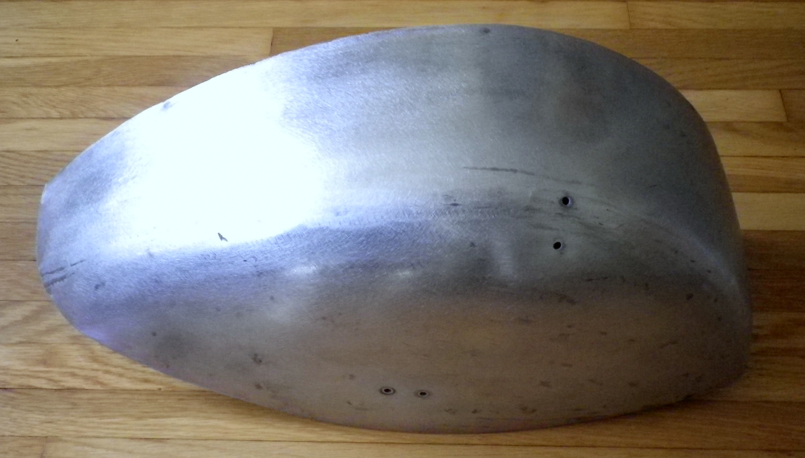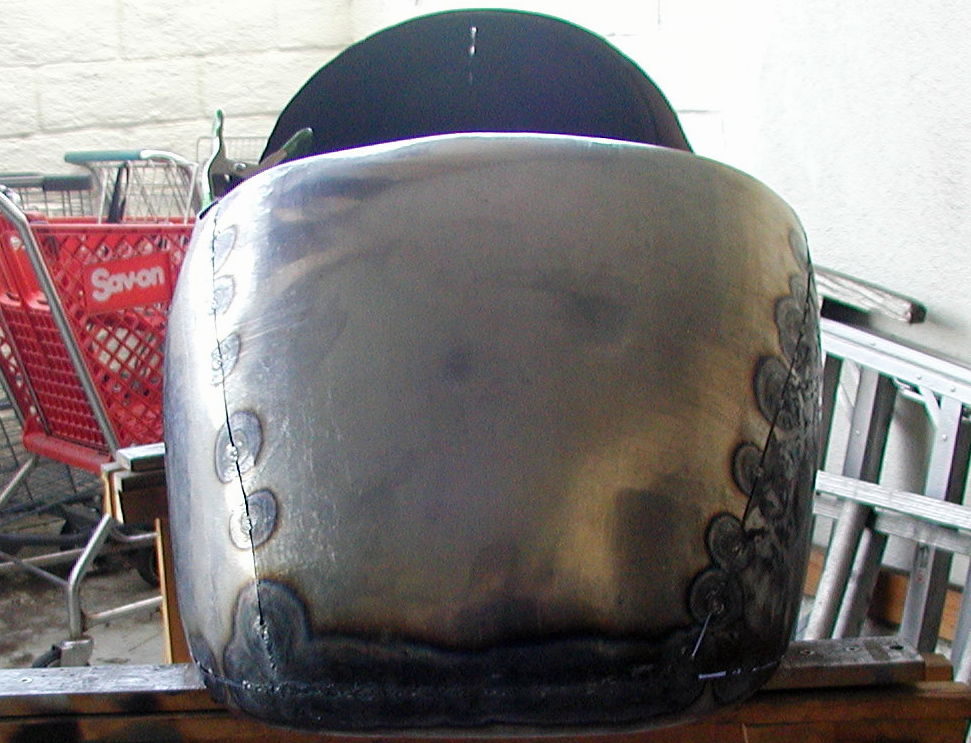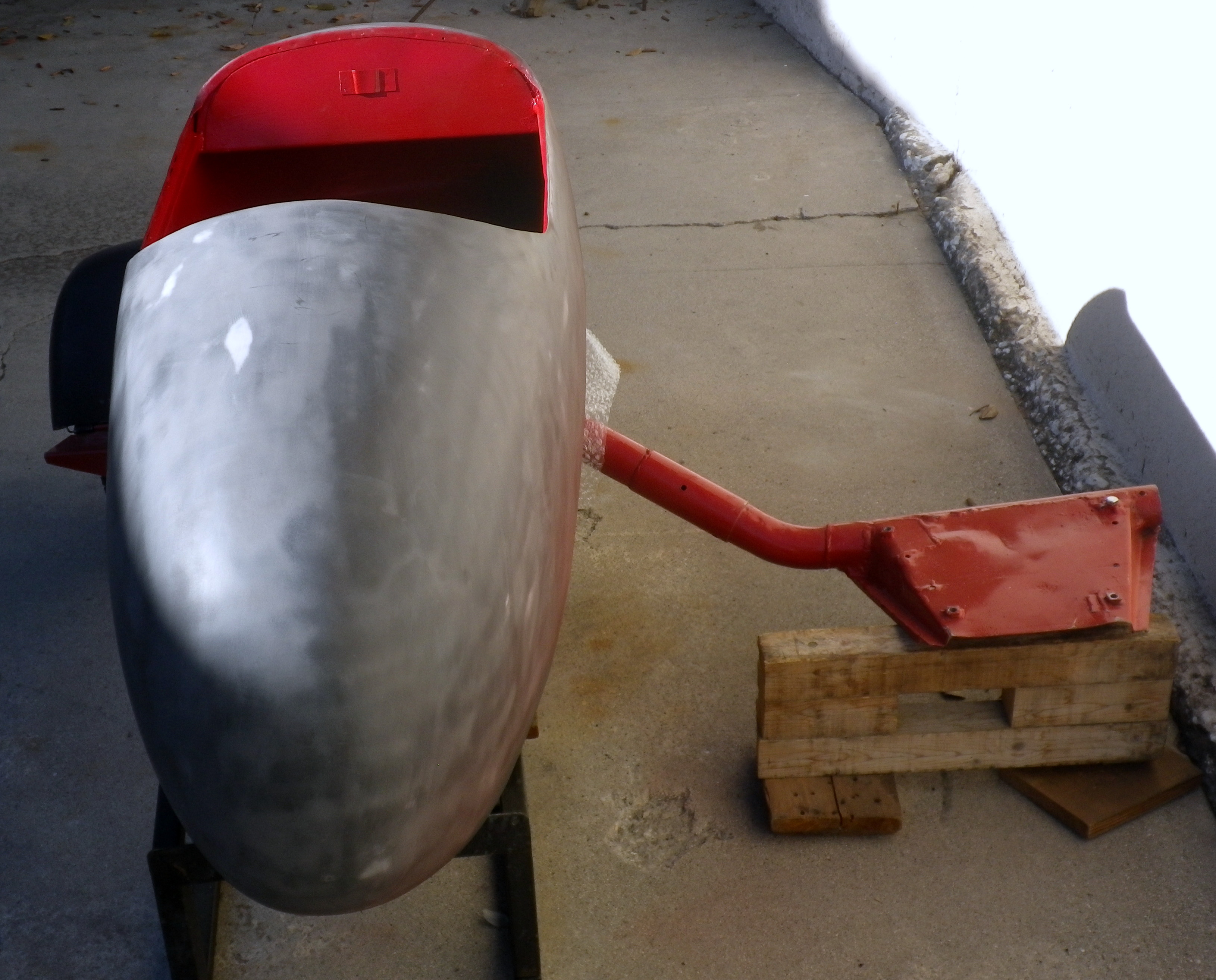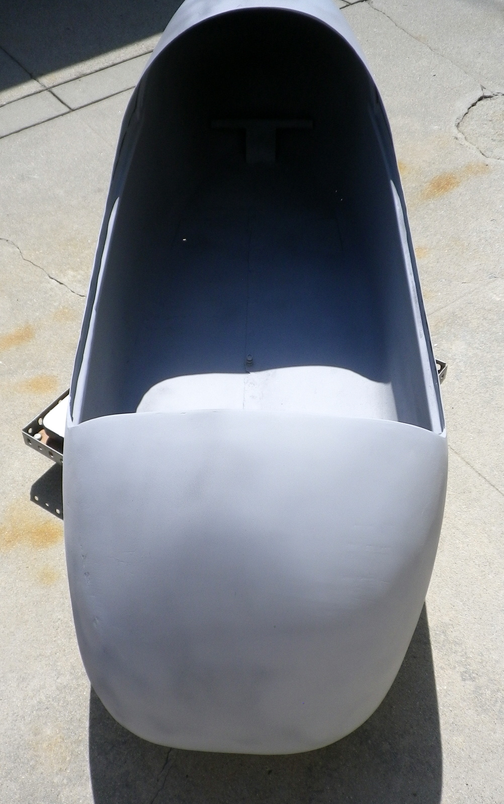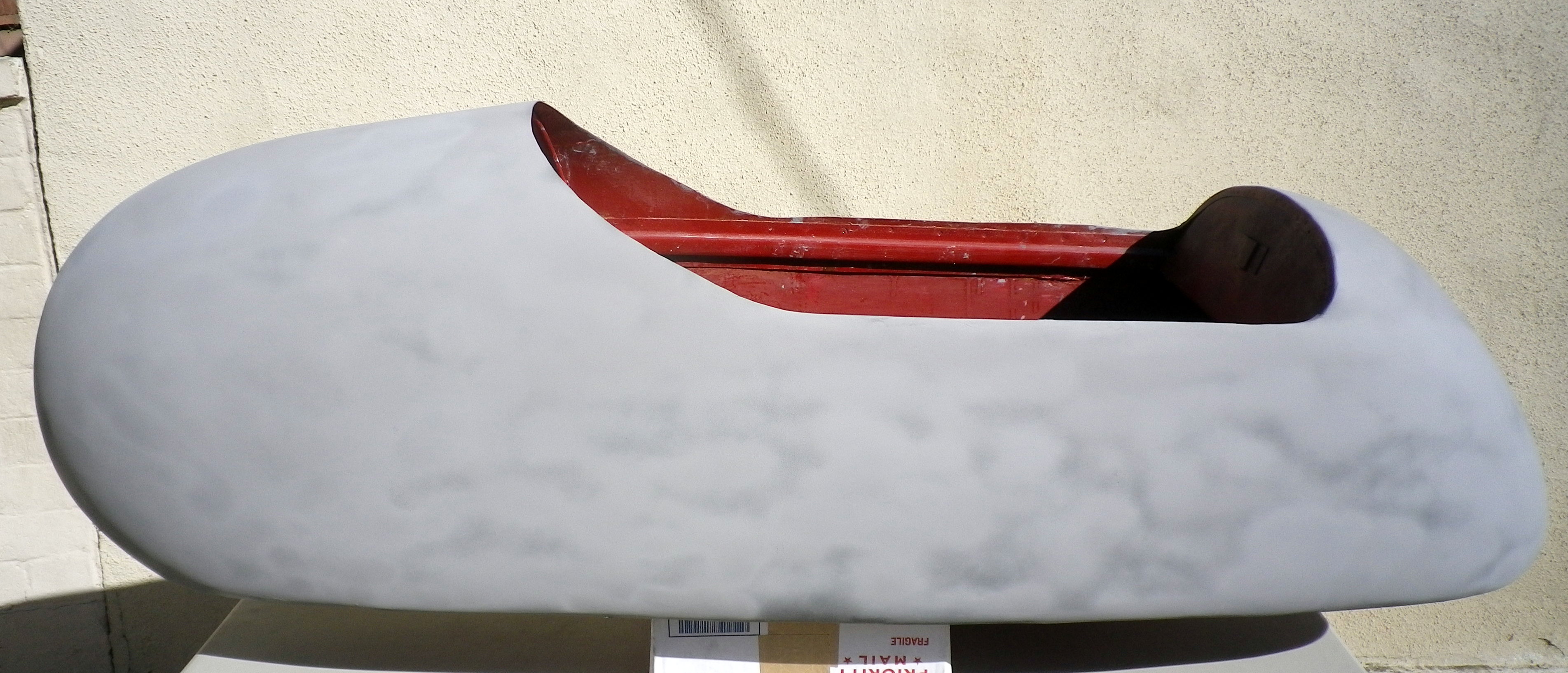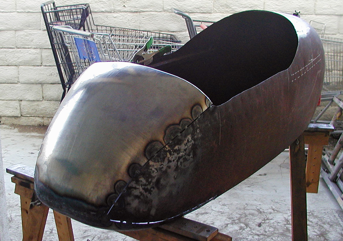 January 26 update from Tim: "I did not put a lot of time on the sidecar this week, but it is coming together nicely. I trimmed the new pieces that I made and skip welded them on. Still have to do a solid weld and then hammer them out smooth, then the tail end will be finished, Then on to other smaller parts of the body." February 1, 2018 - approximately 90% complete! Great work by Tim! After many years of waiting for the sidecar, the end is in sight! Next stop - rust removal by L&M Stripping! As delivered on February 22 to L & M Stripping with its fender: After chemical de-rusting by L & M Stripping on February 27; then picked up by Tim Todd: The fender - after more work by Tim. Ready to be primed on March 29! The fender after one coat of Rust-Oleum auto primer, April 7 April 28, 2018, from Tim: "Have been working hard on the sidecar. I finished up the welding on the tail end and the floor. The floor is giving me a lot of problems. Can't get it very smooth. Trying to blend the new metal with the old is giving me a huge headache. I leaded over the rust holes on the left side and have it mostly filed out. I still have to add the extra support metal for the body bolt holes and a piece on the floor for the seat. Having a lot of trouble smoothing the body out. The old metal must have hardened with age and acid washing. Next week when I get all the parts attached, I will bring it over to you to look at and you can tell me how far you want me to go to try and smooth it out." The sidecar was delivered by Tim Todd on May 8, 2018; ready for priming and painting: In Burbank, May 8, 2018 May 10-12, 2018 - The sidecar interior was treated with "Fast-Etch" to prepare for prime coats. The first light prime coat went on the interior on May 12. Also, the sidecar axle threads were repaired by expert restorer and friend Jerry Miscevich. The new Timken bearings that came with the sidecar wheel (from Dan or Lake Havasu?) are not compatible with the partially threaded 3/4"axle. Bearing cups/races Timken #09195 have been pressed into the wheel, but replacements are needed for cones/bearings #09076 to fit the axle - to be purchased soon! Matching automotive color coat paint will also be acquired - red, of course! May 13, 2018 - Rust-Oleum automotive primer was used for the first prime coat; all of the interior and exterior is done except the bottom: