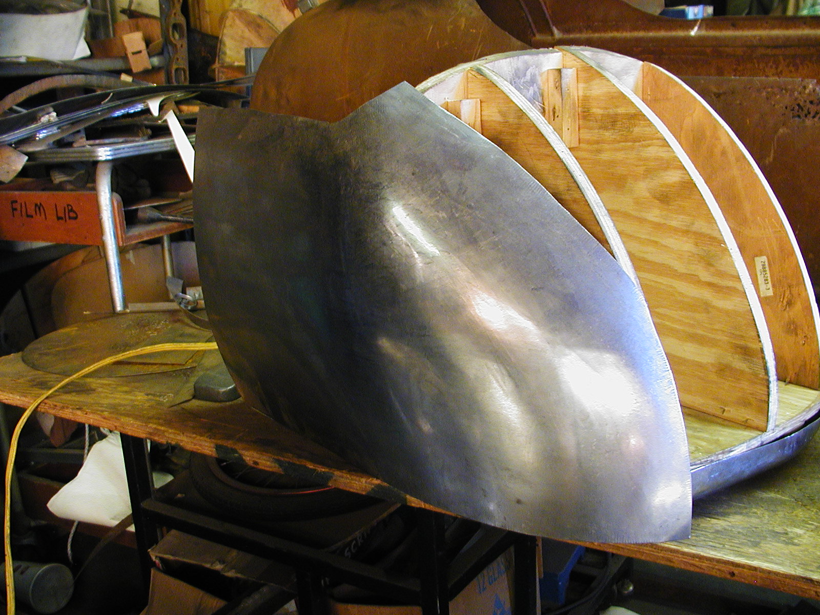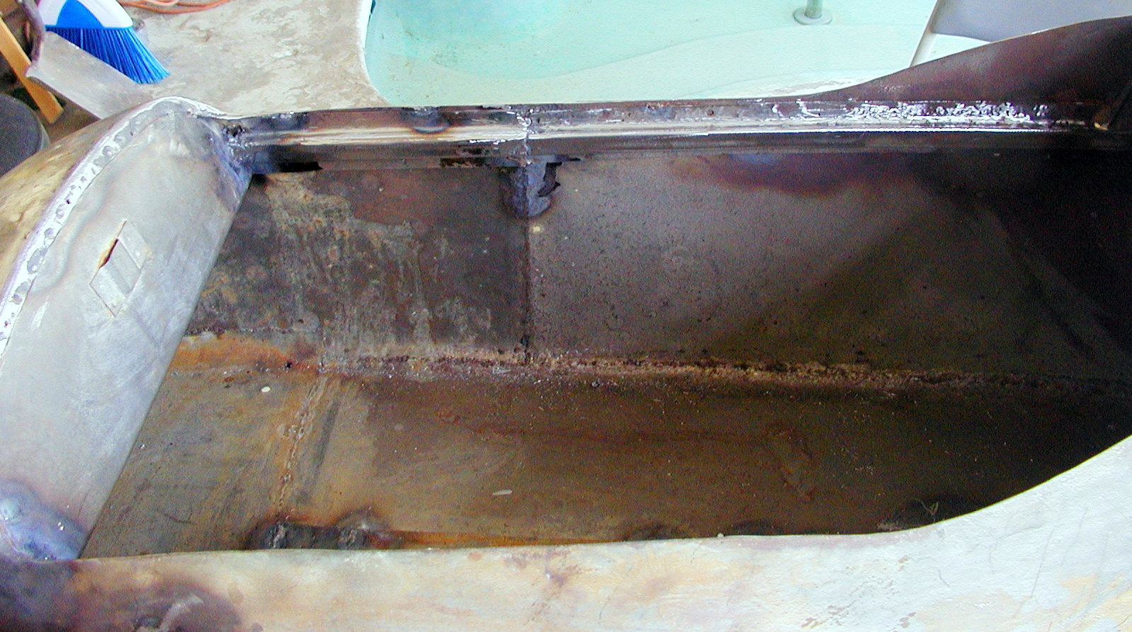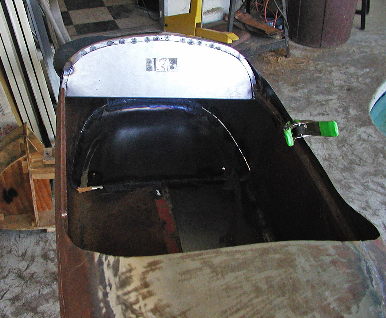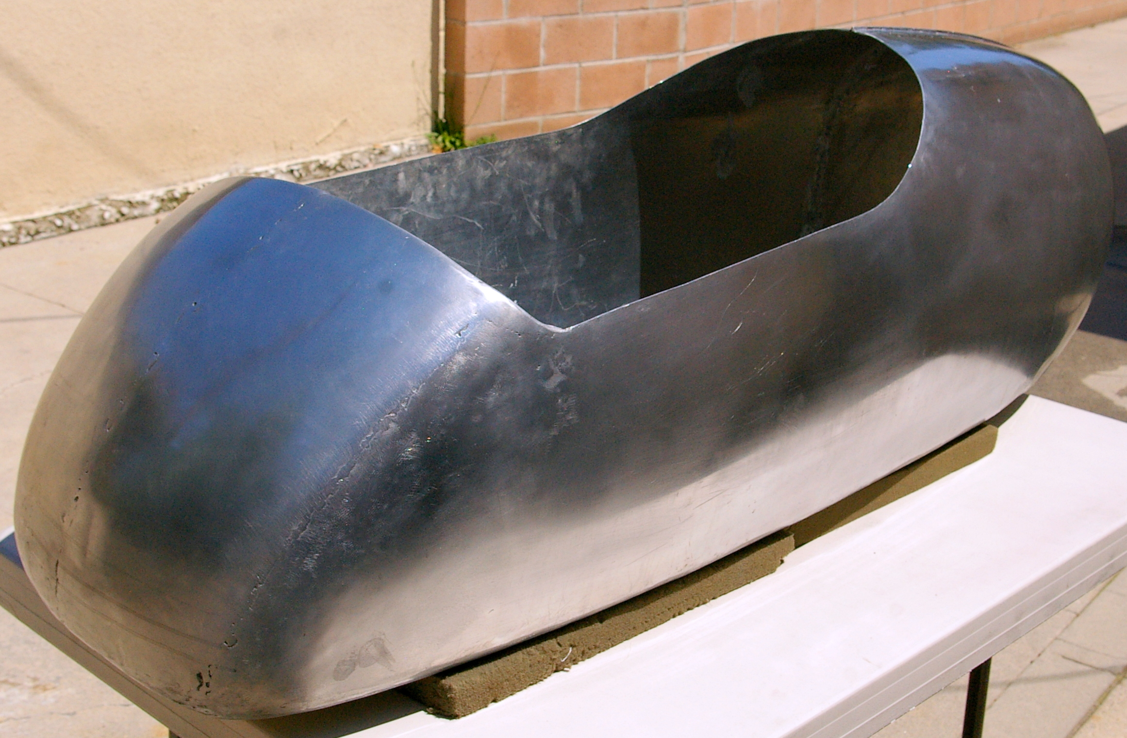 January 26 update from Tim: "I did not put a lot of time on the sidecar this week, but it is coming together nicely. I trimmed the new pieces that I made and skip welded them on. Still have to do a solid weld and then hammer them out smooth, then the tail end will be finished, Then on to other smaller parts of the body." February 1, 2018 - approximately 90% complete! Great work by Tim! After many years of waiting for the sidecar, the end is in sight! Next stop - rust removal by L&M Stripping! As delivered on February 22 to L & M Stripping with its fender: After chemical de-rusting by L & M Stripping on February 27; then picked up by Tim Todd: The fender - after more work by Tim. Ready to be primed on March 29! The fender after one coat of Rust-Oleum auto primer, April 7 April 28, 2018, from Tim: "Have been working hard on the sidecar. I finished up the welding on the tail end and the floor. The floor is giving me a lot of problems. Can't get it very smooth. Trying to blend the new metal with the old is giving me a huge headache. I leaded over the rust holes on the left side and have it mostly filed out. I still have to add the extra support metal for the body bolt holes and a piece on the floor for the seat. Having a lot of trouble smoothing the body out. The old metal must have hardened with age and acid washing. Next week when I get all the parts attached, I will bring it over to you to look at and you can tell me how far you want me to go to try and smooth it out." The sidecar was delivered by Tim Todd on May 8, 2018; ready for priming and painting: In Burbank, May 8, 2018 May 10-12, 2018 - The sidecar interior was treated with "Fast-Etch" to prepare for prime coats. The first light prime coat went on the interior on May 12. Also, the sidecar axle threads were repaired by expert restorer and friend Jerry Miscevich. The new Timken bearings that came with the sidecar wheel (from Dan or Lake Havasu?) are not compatible with the partially threaded 3/4"axle. Bearing cups/races Timken #09195 have been pressed into the wheel, but replacements are needed for cones/bearings #09076 to fit the axle - to be purchased soon! Matching automotive color coat paint will also be acquired - red, of course! May 13, 2018 - Rust-Oleum automotive primer was used for the first prime coat; all of the interior and exterior is done except the bottom: