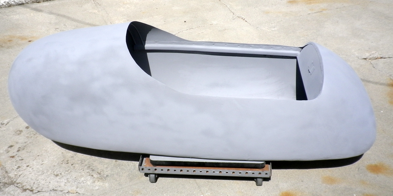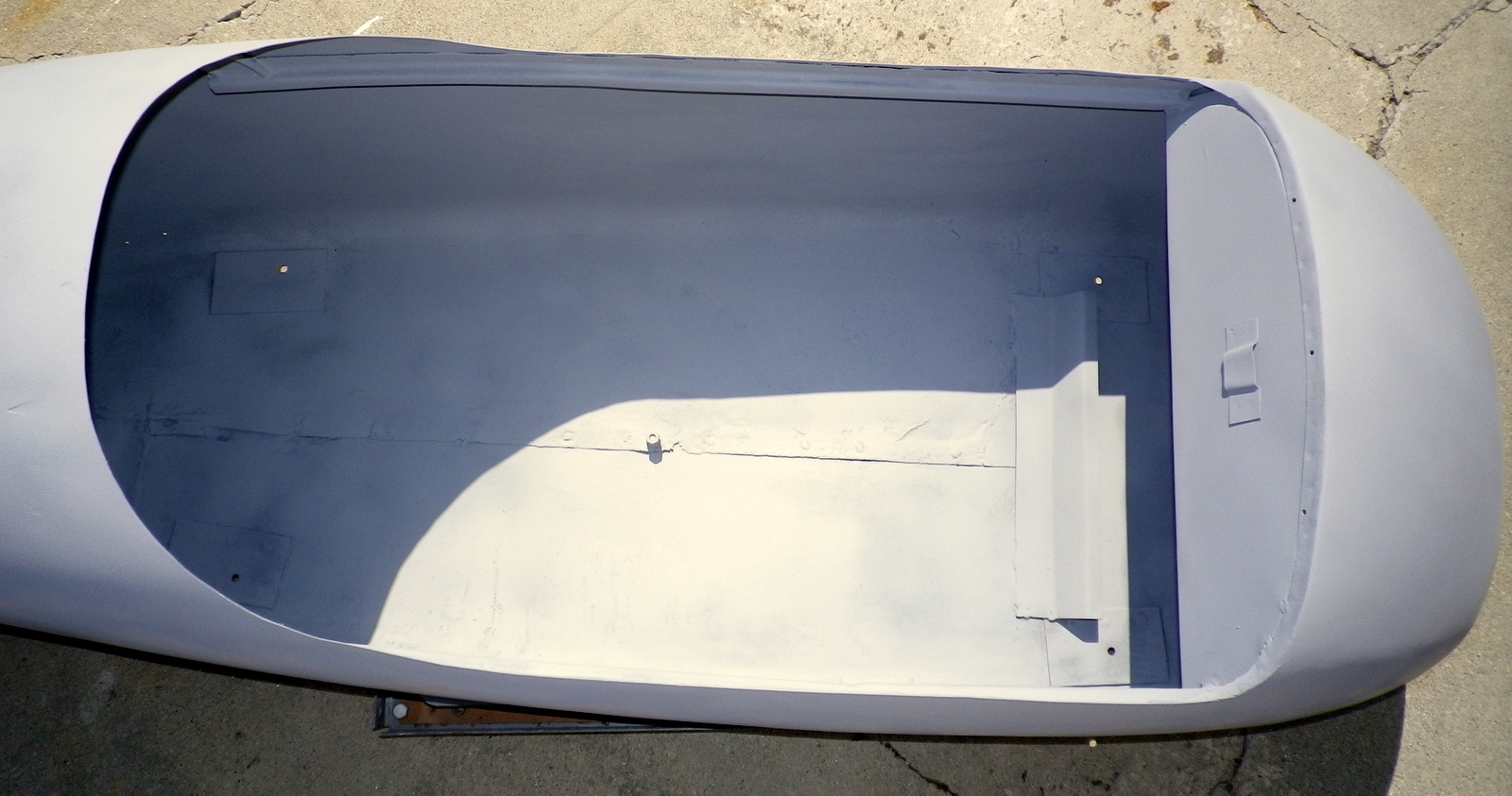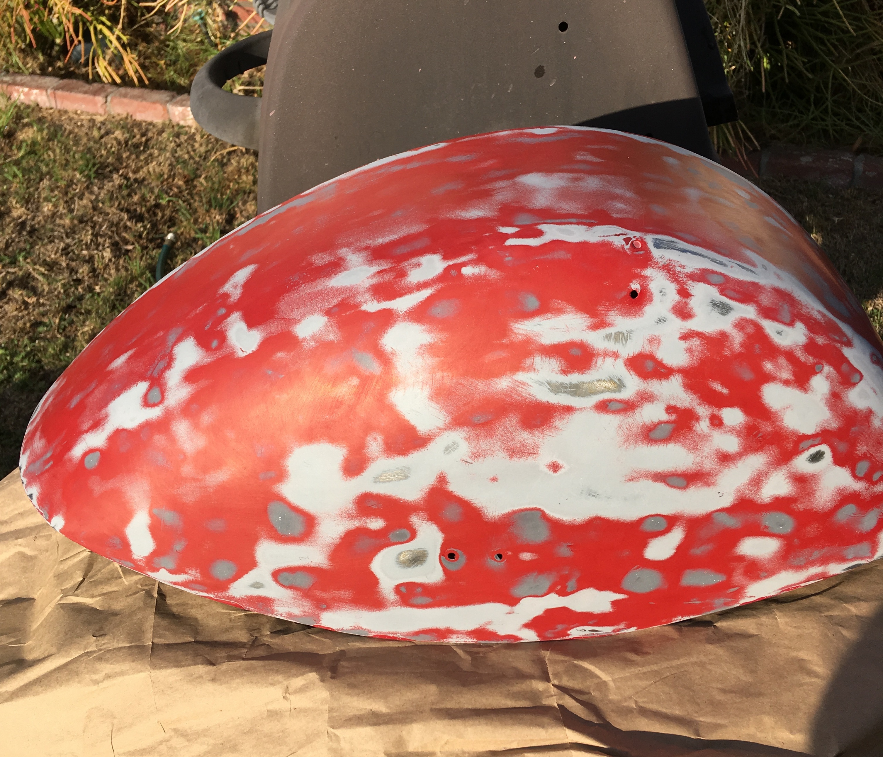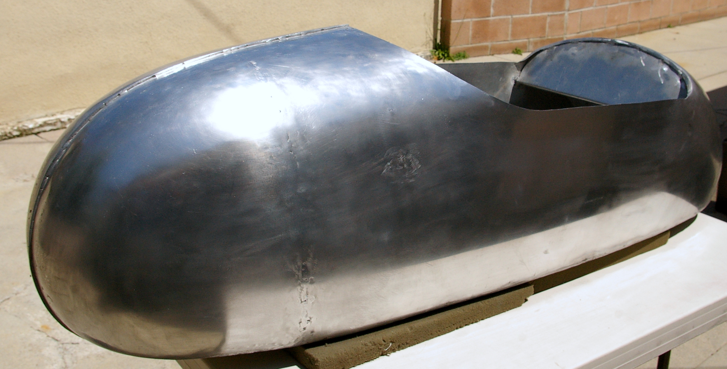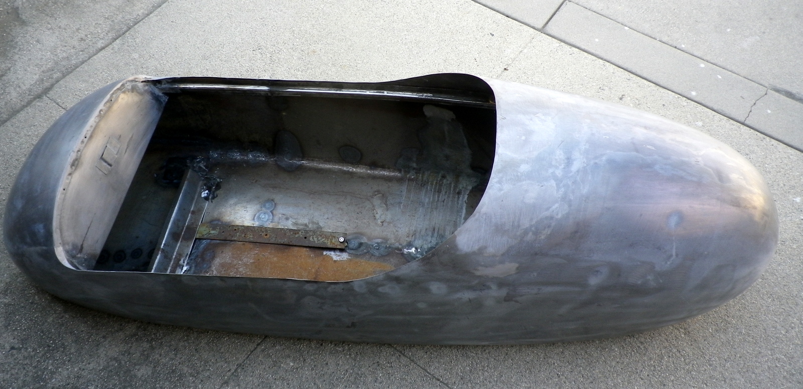 January 26 update from Tim: "I did not put a lot of time on the sidecar this week, but it is coming together nicely. I trimmed the new pieces that I made and skip welded them on. Still have to do a solid weld and then hammer them out smooth, then the tail end will be finished, Then on to other smaller parts of the body." February 1, 2018 - approximately 90% complete! Great work by Tim! After many years of waiting for the sidecar, the end is in sight! Next stop - rust removal by L&M Stripping! As delivered on February 22 to L & M Stripping with its fender: After chemical de-rusting by L & M Stripping on February 27; then picked up by Tim Todd: The fender - after more work by Tim. Ready to be primed on March 29! The fender after one coat of Rust-Oleum auto primer, April 7 April 28, 2018, from Tim: "Have been working hard on the sidecar. I finished up the welding on the tail end and the floor. The floor is giving me a lot of problems. Can't get it very smooth. Trying to blend the new metal with the old is giving me a huge headache. I leaded over the rust holes on the left side and have it mostly filed out. I still have to add the extra support metal for the body bolt holes and a piece on the floor for the seat. Having a lot of trouble smoothing the body out. The old metal must have hardened with age and acid washing. Next week when I get all the parts attached, I will bring it over to you to look at and you can tell me how far you want me to go to try and smooth it out." The sidecar was delivered by Tim Todd on May 8, 2018; ready for priming and painting: In Burbank, May 8, 2018 May 10-12, 2018 - The sidecar interior was treated with "Fast-Etch" to prepare for prime coats. The first light prime coat went on the interior on May 12. Also, the sidecar axle threads were repaired by expert restorer and friend Jerry Miscevich. The new Timken bearings that came with the sidecar wheel (from Dan or Lake Havasu?) are not compatible with the partially threaded 3/4"axle. Bearing cups/races Timken #09195 have been pressed into the wheel, but replacements are needed for cones/bearings #09076 to fit the axle - to be purchased soon! Matching automotive color coat paint will also be acquired - red, of course! May 13, 2018 - Rust-Oleum automotive primer was used for the first prime coat; all of the interior and exterior is done except the bottom:
