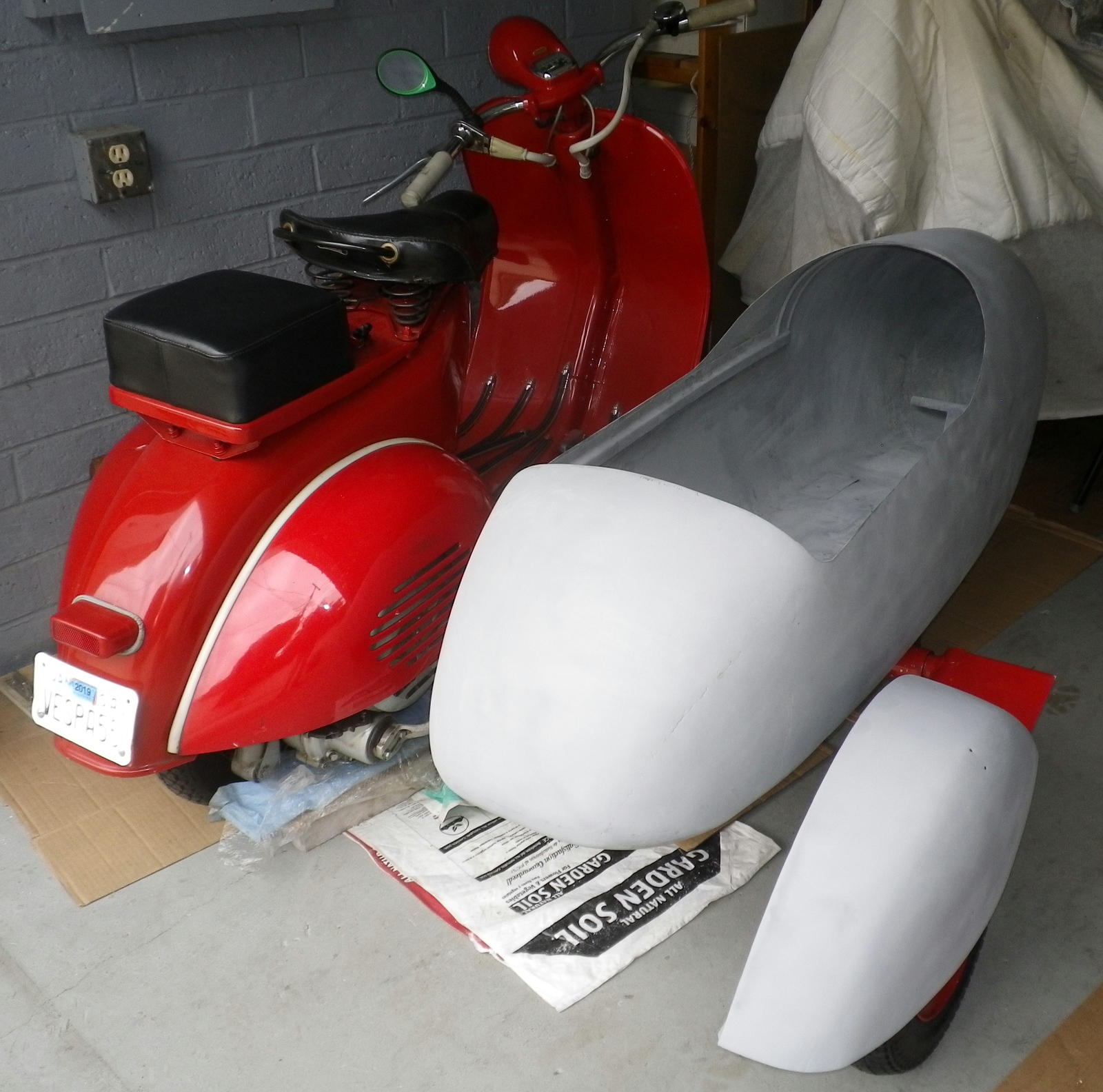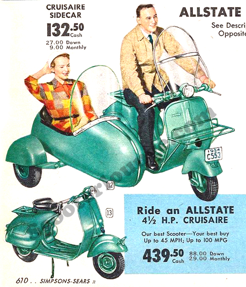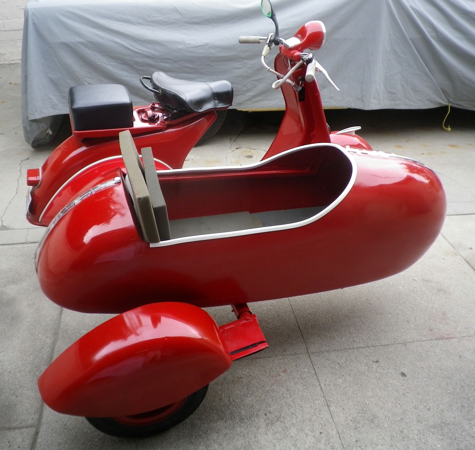 January 1, 2019 - The Vespa got fresh gas (and a 5% Motul oil mix), was started following a "routine", ran well, then went around the neighborhood on two-wheels. The sidecar frame was attached and the rig went down the street on three-wheels then back to the garage. It seems to drive straight and a U-turn was fine. The sidecar was probably last attached to the Vespa in 1960! March 23, 2019 - After drying for several weeks, the last coat of paint showed many flaws, so it was sanded (again!) with 600 grit paper and repainted. Then lightly color-sanded (2000 grit) and partly polished with rubbing compound on March 29. Results are very good - polishing will continue on the rest of the sidecar body. May 15, 2019 - Painting, polishing, waxing is (finally) complete! The photos below show the trim strips attached - a trial fit with protective plastic film still attached. The sidecar and fender are bolted to the frame, but nuts & bolts not yet fully tightened. The seat is "simulated". The Vespa started easily and a test run is planned on the weekend. The '50s advertisement below is for the Allstate sidecar, as sold by Sears - For many details about the Cruisaire sidecar, see this great webpage! Updated: March 30, 2020 |