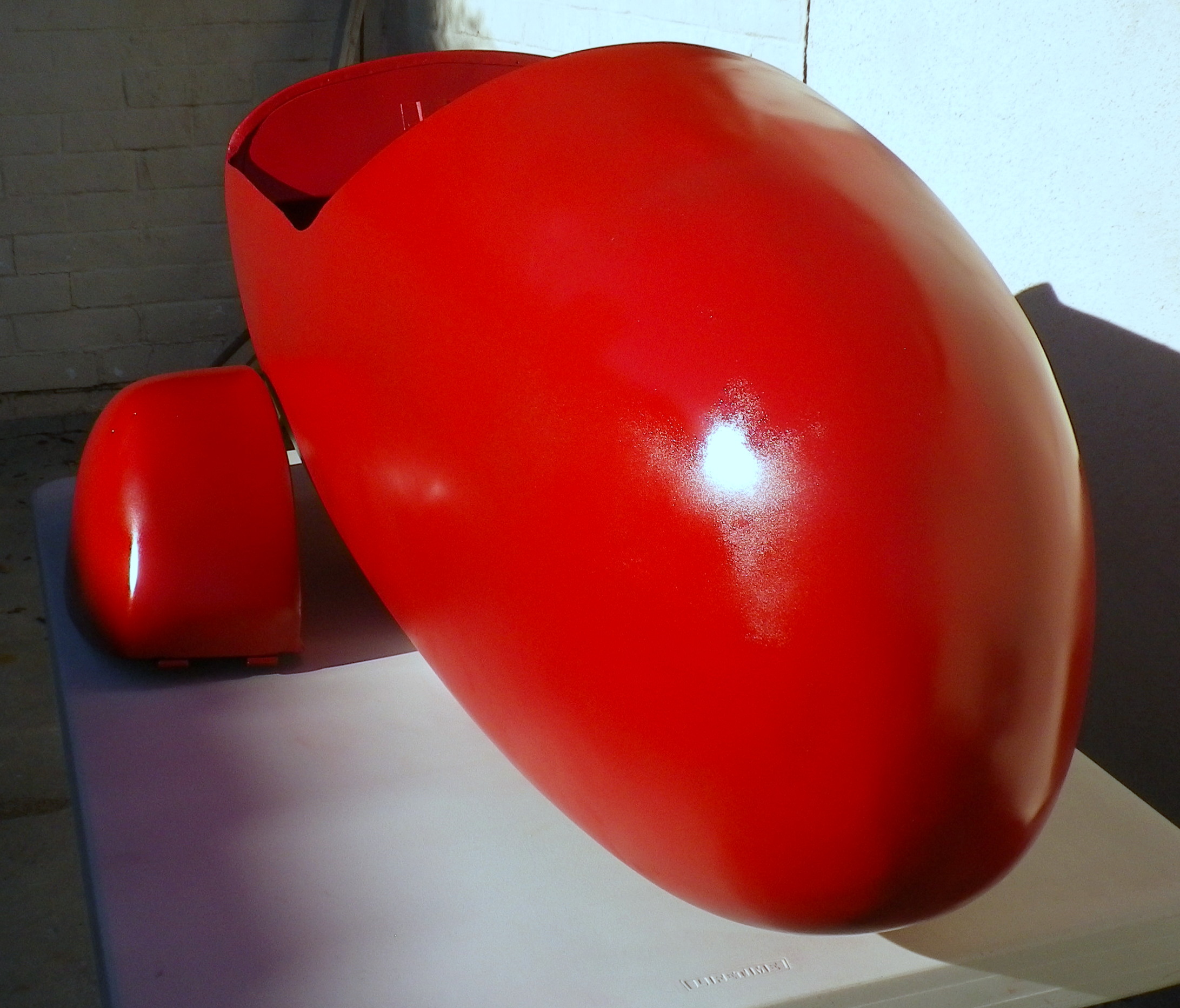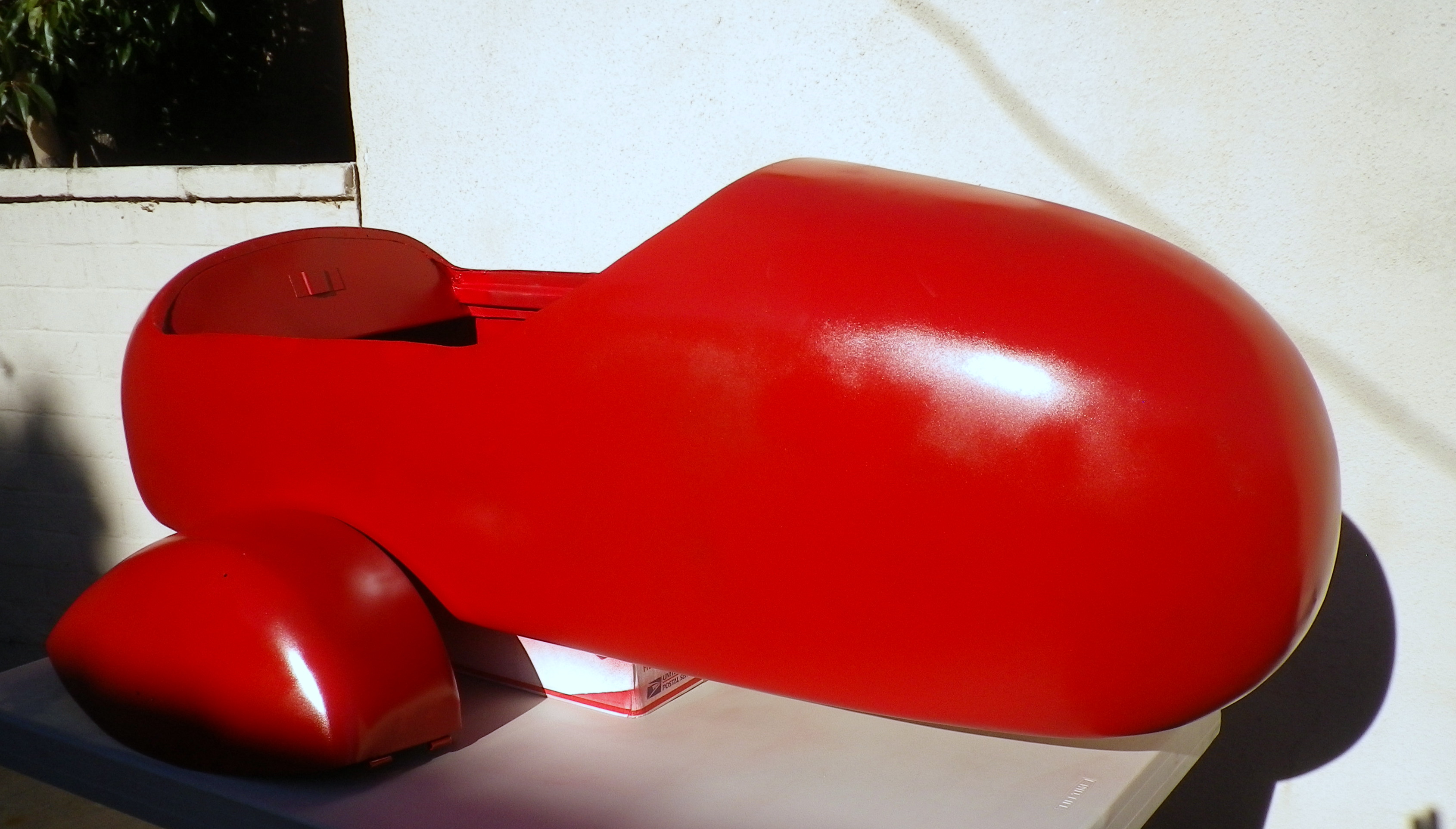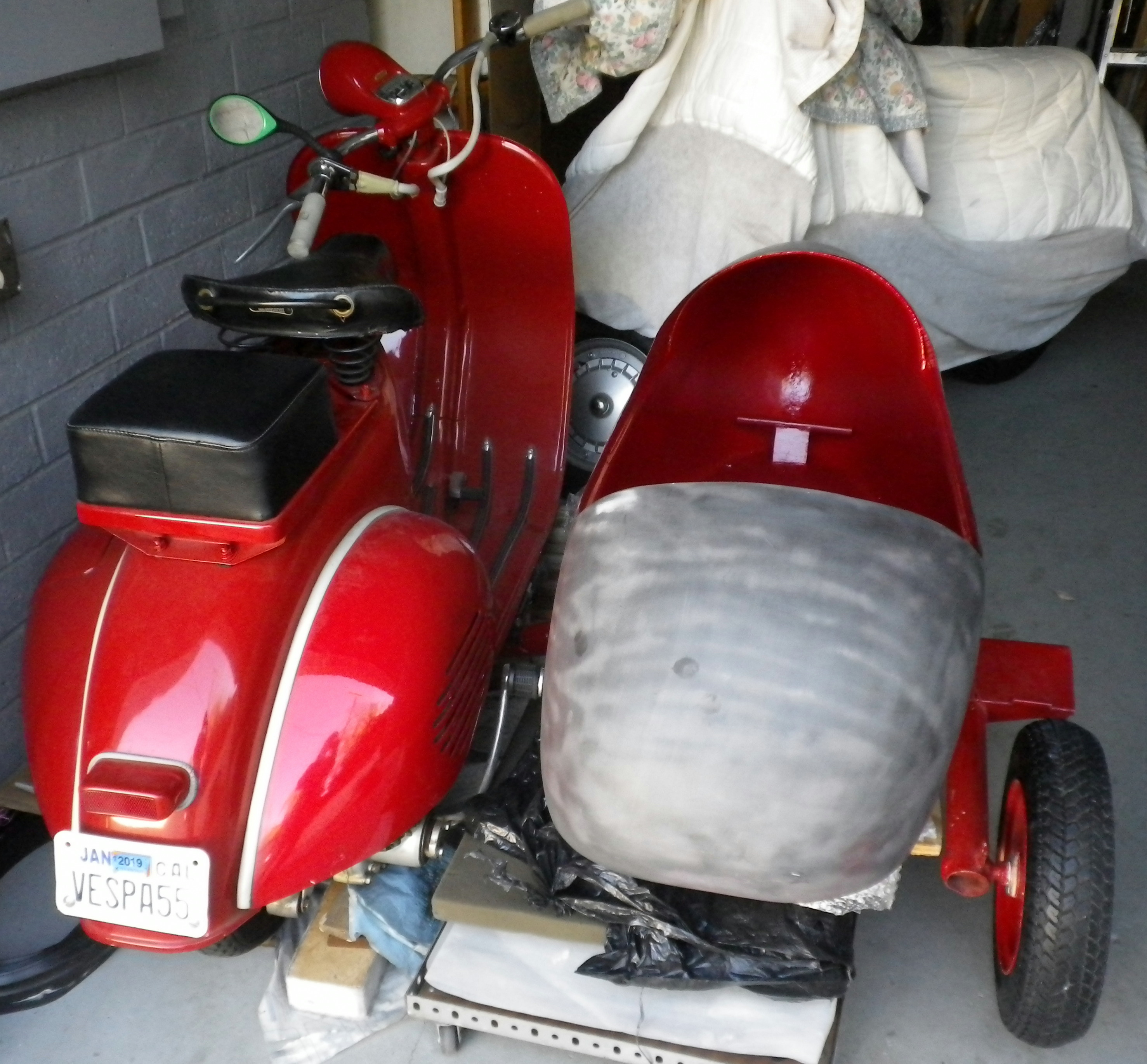 May 14, 2018 - The bottom of the sidecar was primered; the sidecar was set loosely on the frame. The last photo shows the sidecar frame temporarily offset left, which puts the sidecar about 6" too close to Vespa body. The wheel is not yet on the axle. Not shown: Two Timken #09067 tapered roller bearings were purchased from Applied Industrial Technologies. Old red paint was removed from the axle and a "trial fit" confirmed these bearings fit the wheel and the axle. May 19, 2018 - The sidecar wheel was left at Master Auto Parts (Sun Valley) to match the Vespa red paint. Rick said the new paint would be put in spray cans and ready for pick up on May 21. May 21, 2018 - The color-matched red paint and the sidecar wheel were picked up from Master Auto Parts. Bearings were greased, set in the wheel and the wheel was installed on the axle. Photos below show another trial fit, with the sidecar located correctly on the frame. Sanding, filling, painting next! September 17, 2018: Under cover for 3 months when another project needed attention! Only visible progress is on the fender - the sidecar body had much sanding and filling, but progress is not obvious! November 12, 2018: Work on the sidecar resumed on November 8, after the 1980 Maserati Quattroporte was taken to a car show and I think it is now "sufficiently done". Good friend Jerry Miscevich took the fender home for expert attention. Photos below show it's ready for final red painting. Jerry advised me that further sidecar sanding and priming should be with with increasingly finer paper grits - 220, 320, 360 and 400. I wet-sanded it with 400 this date and it seems only a few small areas require further body putty filling and priming. Red paint next week? November 22, 2018: The photos below on Thanksgiving Day, show the sidecar and fender after more "prime, sand, prime, etc." stages. Next - the grey primer will be wet-sanded with 400 grit paper, then a dark grey prime coat will follow. Another wet-sanding should have it ready for color! December 1, 2018 - The sidecar interior and bottom have been painted with Rusto-Oleum "Sunset Red" and the body got two dark primer coats so that sanding would show up high and low spots. Just one more inspection and sanding before spraying the custom-mix red paint! Also, two long-missing original bearing/axle caps were found in the corner of our garage. These will improved the sidecar wheel appearance when de-rusted, painted and installed. December 8, 2018 - Just after the December 1 report, the sidecar was sprayed with a first coat of the custom-mixed red paint; further work was slightly delayed by two days of heavy rain. A second paint coat this day gave good results, as shown in the photos below. Inspection and any needed touch-ups next! December 25, 2018 - Work continued after the December 8 status. The custom-mixed paint was used up after the second coat. Two more spray cans and an extra pint were mixed by Master Auto Parts. On December 24, I did light sanding with 500 grit paper to get a smooth surface; coat #3 was applied to both the sidecar and the body. The frame was touched up with Rust-Oleum Sunset Red. The Vespa, the frame and sidecar were "staged" together for the Christmas photos below.