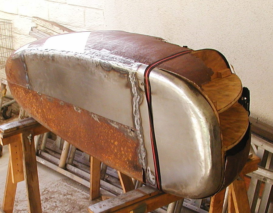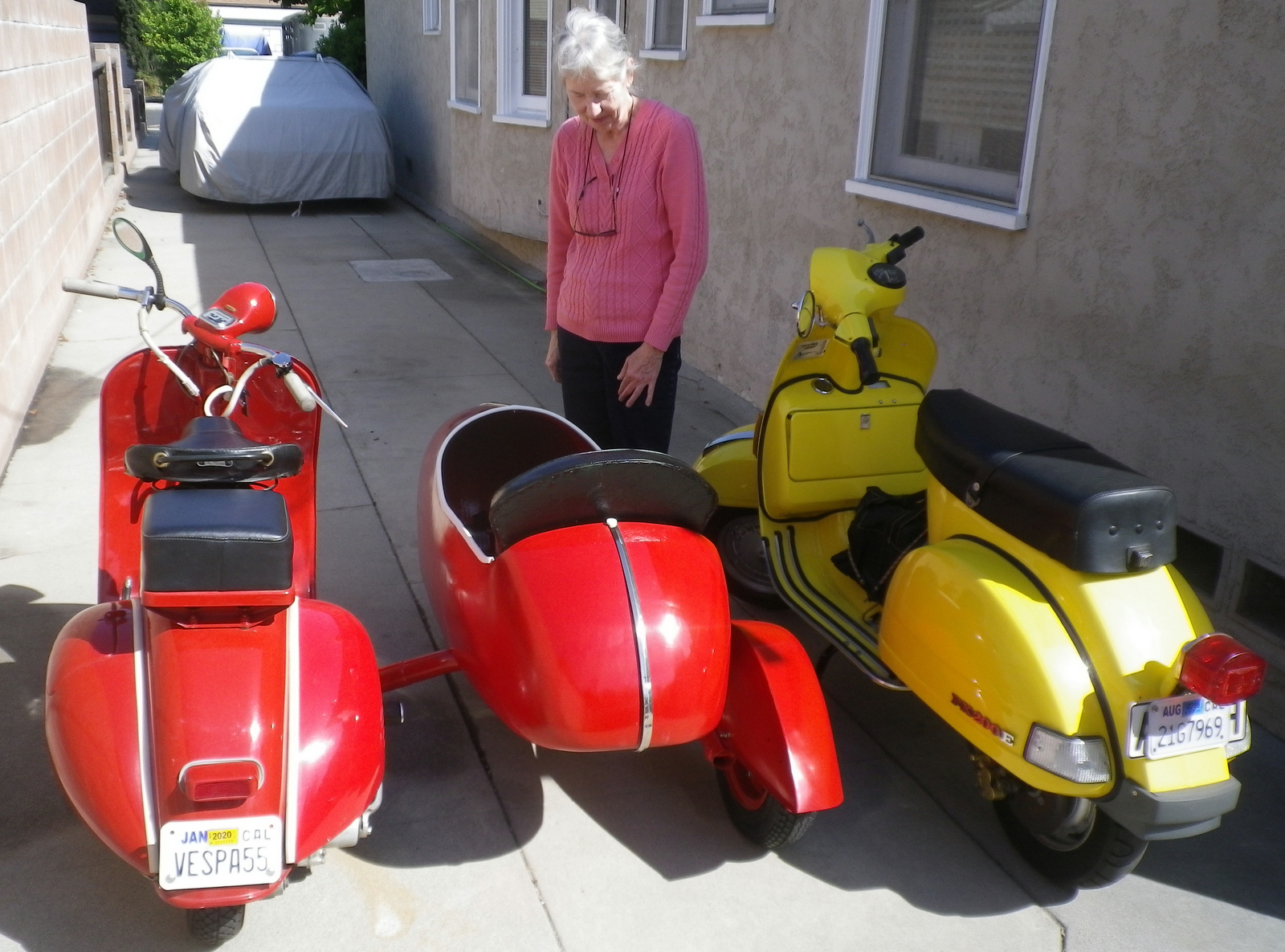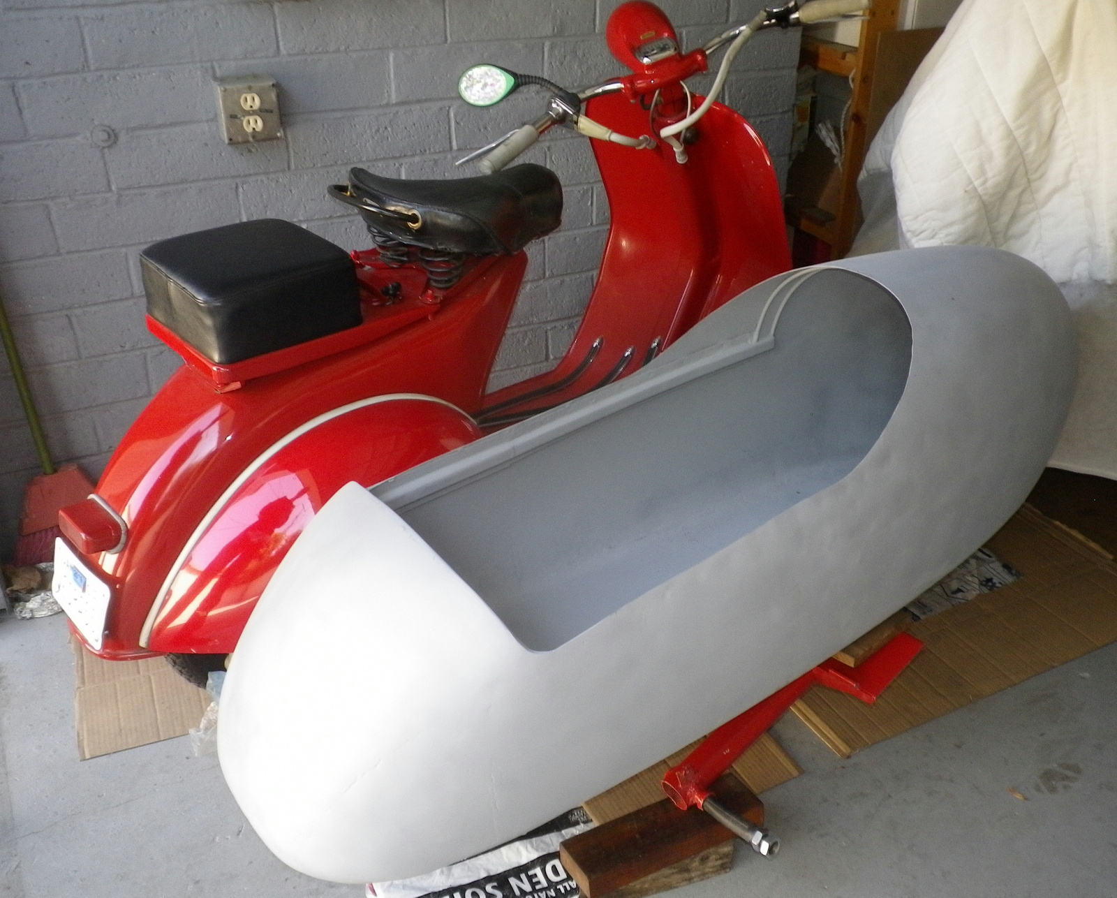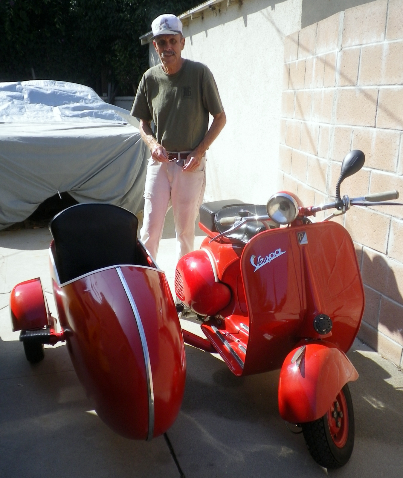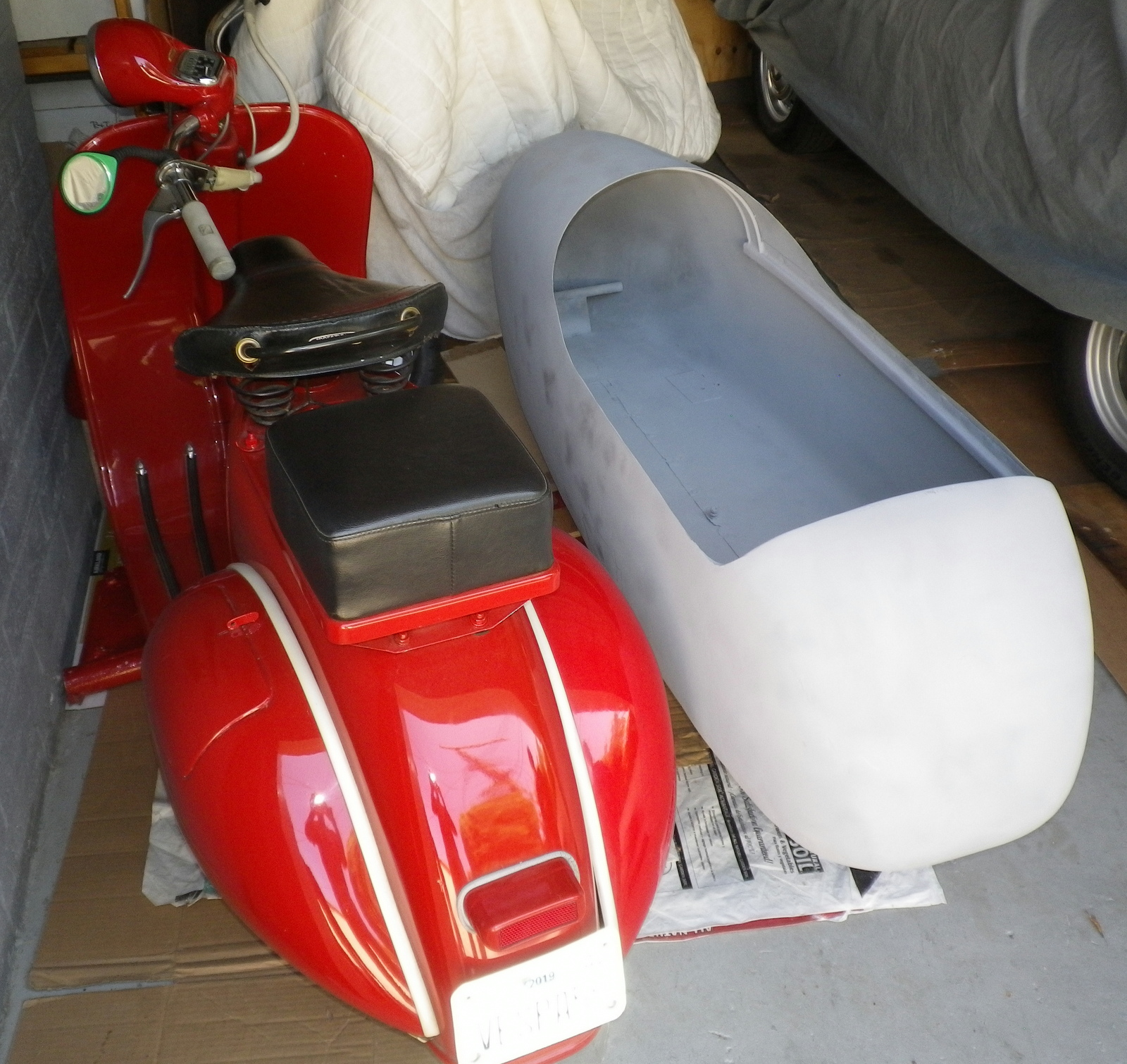 A Tale of Two Vespa Sidecars: An Allstate Cruisaire sidecar and an Aluminum Replica May 1, 1958 - April 15, 2020 May 30, 2019: 61 years after first driving the Vespa and sidecar in Chicago, it passed a test drive on our local Burbank streets. We later toasted with Proseco! A few weeks later, Shannon became the first sidecar passenger since 1960! The above photos were taken in Chicago, about 1959. Bob is on the Vespa, with a wooden delivery box on the sidecar chassis. The location is our all concrete "backyard" behind the family apartment at 4606 N. Kedzie Avenue. No early photos of the metal "Allstate Cruisaire" sidecar body with the Vespa! I bought the Vespa from the Manor News Agency on May 1, 1958 specifically to deliver newspapers. I had started delivering 50 copies of the Chicago Daily News about four years earlier on my bike with a single afternoon route on Wilson and Eastwood avenues, but planned to shift to morning deliveries before starting high school. Illinois had recently changed a law to allow scooters under 5 hp to be driven at age 14, so a few weeks after purchase, I add two routes of the Chicago Tribune and Sun-Times in the (very) early morning. The Vespa allowed me to deliver "tons" of newspapers before I moved on to another job. The sidecar was made from steel and had an Allstate identity plate I later learned it's an "Allstate Cruisaire Companion". The Vespa stayed in Chicago until 1996, first in the garage adjoining our backyard on Kedzie Ave. and later at my brother Dan's house on Kilpatrick Ave. Sometimes inside, sometimes outside. The sidecar body and frame at Dan's house on Kilpatrick Ave, Chicago, in 1991 The Vespa and both sidecars were originally light green, as bought May 1, 1958. After a few years, I painted the Allstate sidecar and the Vespa red, but the seat cushions in the sidecar remained dark green. The Illinois Vespa title shows serial number "VLIM 60834, but this doesn't match any of the factory listed numbers, so a correction was expected. Dan brought the Vespa to Arizona, then to California from Chicago in August, 1996. I met Dan in Lake Havasu AZ at Bruce and Colin Kimmins' shop. Because the Allstate sidecar had been left outside in Chicago for many years, it was very rusty. Bruce decided to build an aluminum replica body rather than work on the rusty steel. Within a few days, Bruce had fabricated half of the sidecar shell. The original sidecar body and frame were left with Bruce.An aluminum "replica" over the original rusty steel sidecar, August 1996. So what happened to the Allstate sidecar, left with Bruce Kimmins in Lake Havasu in August 1996? Not much! In October 2017 we rented a van, drove to Bruce's shop in Lake Havasu and picked up both sidecars. The aluminum replica was about 80-90% complete.The aluminum replica sidecar, retrieved from Lake Havasu City, AZ Packard restorer and builder Jerry Miscevich introduced me to Tim Todd, the metal worker who fabricated a steel body for Jerry's 1929 Packard Speedster. Jerry's great car was featured on Jay's Leno's Garage. Tim looked at both sidecars and agreed the Allstate sidecar could be saved. Much later, Tim also completed the aluminum replica.After welding and finish work by Tim Todd, November 2019: The replica sidecar, after sanding and polishing, April 2020: The rusty Allstate Cruisaire sidecar, October 2017: Tim took the original rusty steel sidecar to his shop on December 4, 2017 and within a few days had built patterns to shape the very rusty rear part of the sidecar.