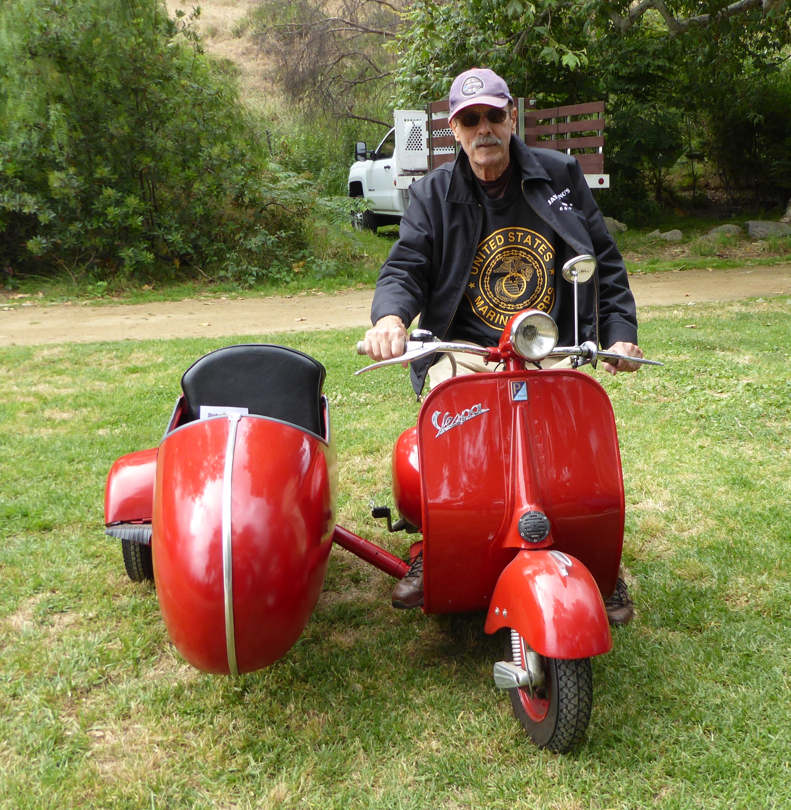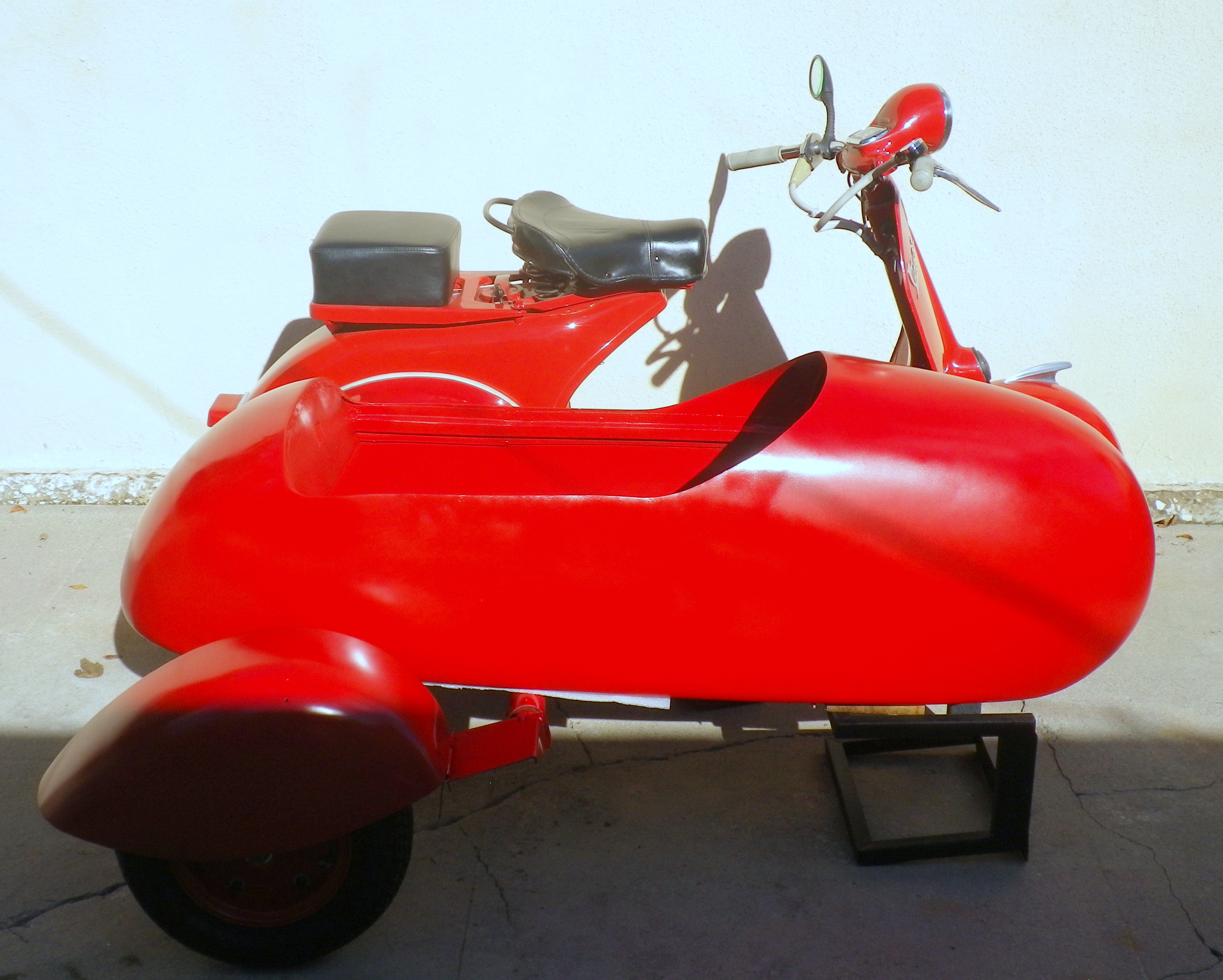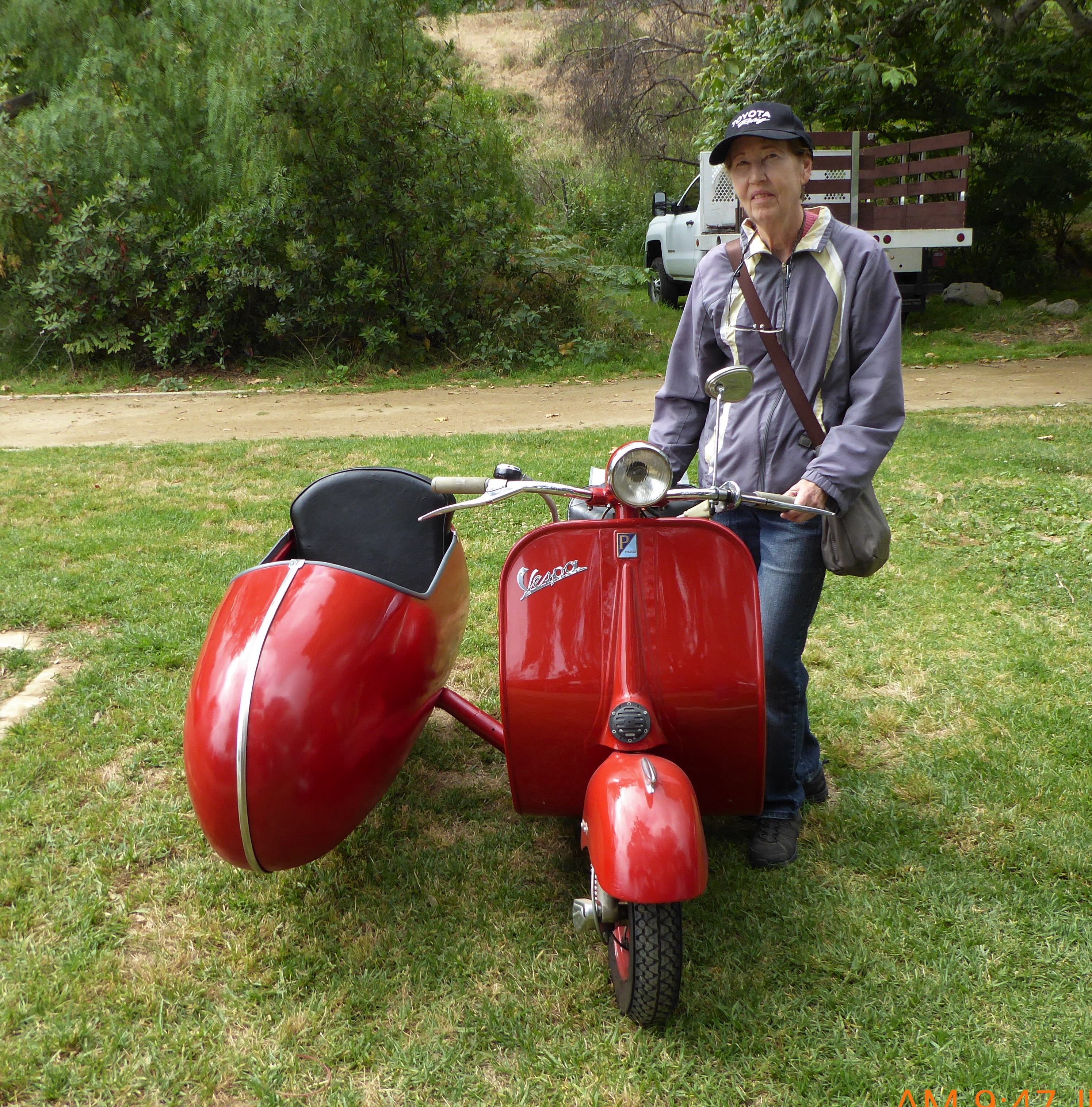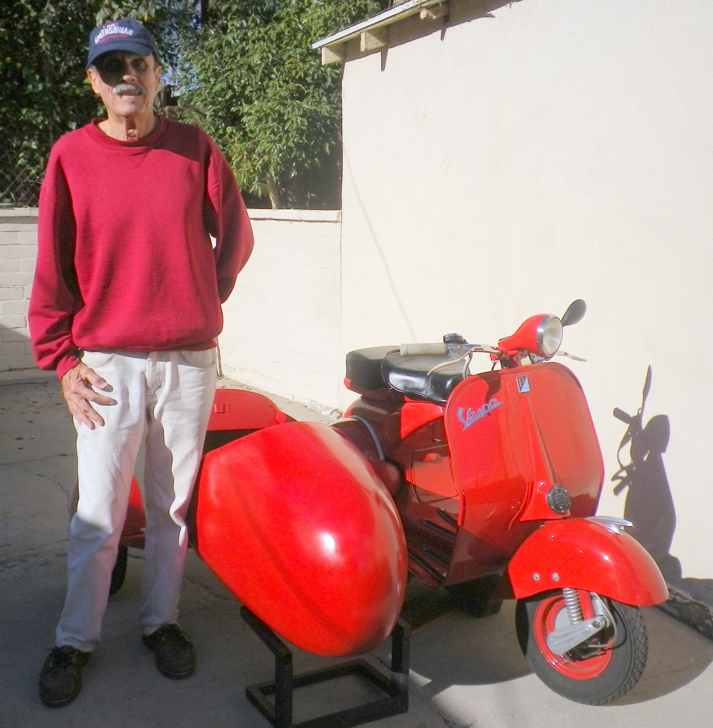 Bob's 1955 Vespa, with an Allstate sidecar 1958-2023 Vespa Celebrates 75th Anniversary! May 30, 2019 status: The Vespa and the sidecar are complete! At the Road Kings Car Show - June 11, 2023: At the Road Kings Car Show - June 12, 2022: Look for us again at the next Road King's show at Johnny Carson Park! The Restoration is Finally Complete! May 30, 2019: 61 years after I first drove the Vespa and sidecar in Chicago, I took it on our local Burbank streets. A few weeks later, Shannon became the first sidecar passenger since 1960 - we later toasted with Prosecco! Where it all began: The photos above were taken in Chicago, about 1959. Bob is on the Vespa, with a wooden delivery box on the sidecar chassis. The location is our all concrete "backyard" behind the family apartment at 4606 N. Kedzie Avenue. I have not found any early photos of the metal "Allstate Cruisaire" sidecar body with the Vespa. I bought the Vespa from the Manor News Agency on May 1, 1958 specifically to deliver newspapers. I had started delivering 50 copies of the Chicago Daily News about four years earlier on my bike with a single afternoon route on Wilson and Eastwood avenues, but planned to shift to morning deliveries before starting high school. Illinois had recently changed a law to allow scooters under 5 hp to be driven at age 14, so a few weeks after purchase, I add two routes of the Chicago Tribune and Sun-Times in the (very) early morning. The Vespa allowed me to deliver "tons" of newspapers before I moved on to another job. The sidecar was detached around 1960 and the Vespa took me to several jobs, including my summer lifeguard work at the Hollywood-Ardmore Beach. Two other Hollywood-Ardmore lifeguards at Thorndale Beach - Marv is on my Vespa! Close Encounters of the Ferrari Kind One commute to a summer job was very memorable. I had made a left turn from Foster Ave to California Ave, near Swedish Covenant hospital when a pulled up along a pale gold Ferrari with "flying butresses" extending from the roof to the trunk. It took many years to ID this car - clearly it was the "Ingrid Bergman Ferrari 375 MM", S/N 0456AM. What year was this, who was the owner and why was it in Chicago? The Vespa then "went to the university" for a year, in 1965-66.Visiting home from school in South Bend, 1963 The sidecar was made from steel and had an Allstate identity plate I later learned it's an "Allstate Cruisaire Companion". The Vespa stayed in Chicago until 1996, first in the garage adjoining our backyard on Kedzie Ave. and later at my brother Dan's house on Kilpatrick Ave. Sometimes inside, sometimes outside. The sidecar body and frame at Dan's house on Kilpatrick Ave, Chicago, in 1991 The Vespa and both sidecars were originally light green, as bought May 1, 1958. After a few years, I painted the Allstate sidecar and the Vespa red, but the seat cushions in the sidecar remained dark green. The Illinois Vespa title shows serial number "VLIM 60834, but this doesn't match any of the factory listed numbers, so a correction was expected. I last used the Vespa at Notre Dame in 1966, after taking it to South Bend in the trunk of a 1965 GTO! I graduated from Notre Dame in 1966 and began five years of active duty in the Marine Corps - in Virginia, Florida, North Carolina, Vietnam (Chu Lai) and finally Honolulu. I owned several "interesting" cars during this time but did not forget the Vespa. In 1992-3, my brother Dan restored the Vespa scooter in Chicago for his TV motorcycle show. Unfortunately, a well-known classic Vespa dealer in Chicago returned an incorrect, different engine to Dan. The engine he installed was a 125 cc engine from a "Sears Allstate" scooter. It was also defective - rough and very smoky. Dan brought the Vespa to Arizona, then to California from Chicago in August, 1996. I met Dan in Lake Havasu AZ at Bruce and Colin Kimmins' shop where they had my Frazer Nash for restoration (see FrazerNash-USA.com). Because the Allstate sidecar had been left outside in Chicago for many years, it was very rusty. Bruce decided to build an aluminum replica body rather than work on the rusty steel. Within a few days, Bruce had fabricated half of the sidecar shell. The original sidecar body and its chassis were left with Bruce. An aluminum "replica" over the original rusty steel sidecar, August 1996. After the Vespa came to my Burbank Maple street apartment garage, a few weeks later I loaded it into a U-Haul trailer to take it to the Santa Barbara Concours on September 21, 1996. / Santa Barbara Concours d'Elegance, September 21, 1996, exactly the same date as Piaggio was celebrating its 50th anniversary. The driver is the same as in the photos above! After the Concours, I took the Vespa to two scooter shops in Los Angeles to have a correct Vespa 150 engine installed. Locating an engine and getting it installed took more than 4 years! Kristian Storli, at Bar Italia Classics, did great work on the entire scooter and delivered it to our garage in Burbank on January 5, 2010. The Vespa did not have a "proper" kickstand and was not registered in California. Registration was a challenge! Although I had an 1959 Illinois registration in my father's name, the serial number was probably wrong because it didn't match any of the published lists. I scratched the paint off the serial number in mid-December 2009 and thought I found the right number. I first went to the Auto Club with California DMV forms from the Internet, but was told I had to get a replacement Illinois title. I made that application on January 28 with much documentation. The Illinois Secretary of State responded, stating that there were no title records from that time. I next went to the Glendale DMV with my paperwork, hoping they would use the uncovered serial number and issue a title. The inspection clerk didn't have much patience and marked the form as "not legible", but I did get a temporary registration until April 30, 2010. On April 12, I took the Vespa to the California Highway P