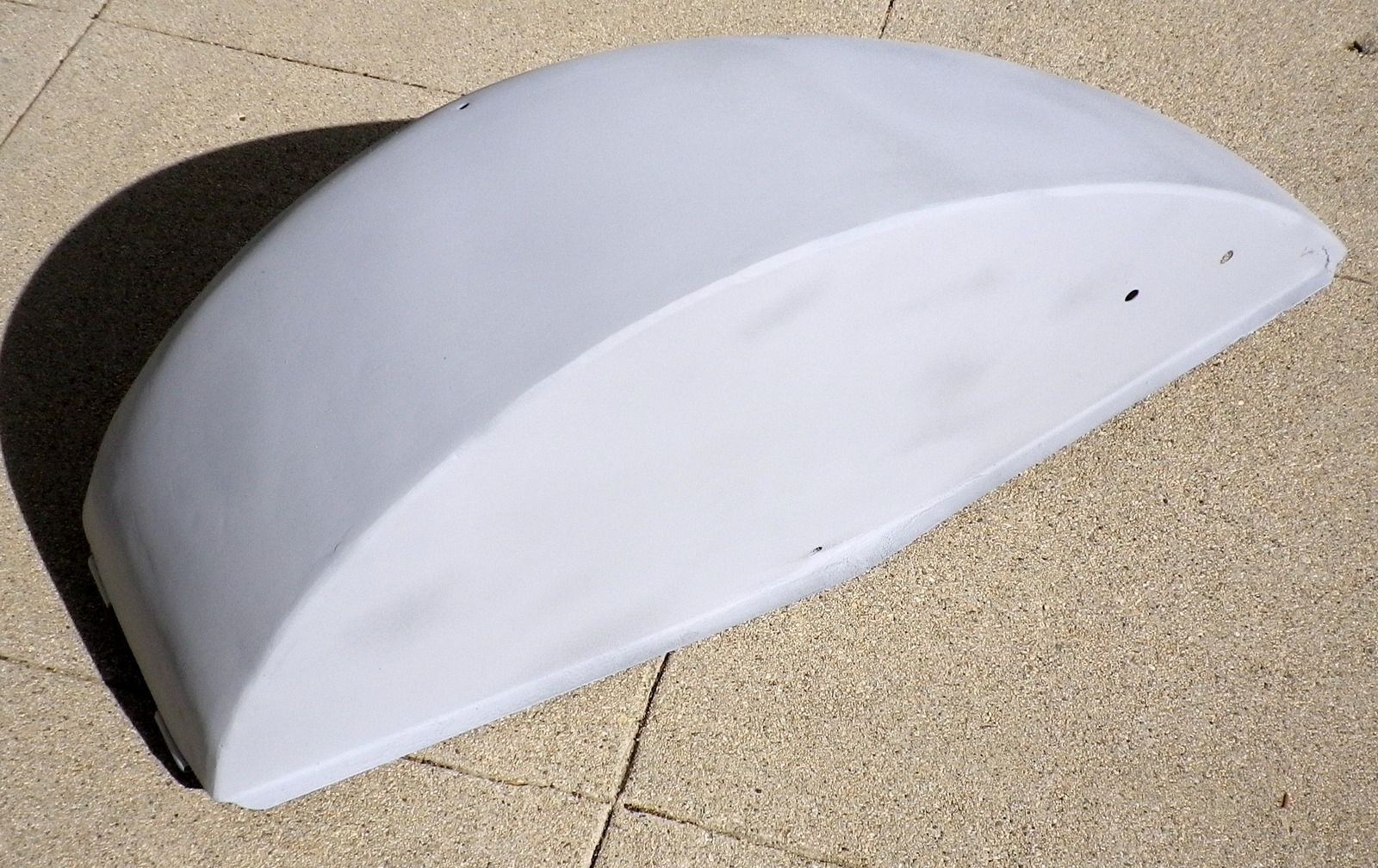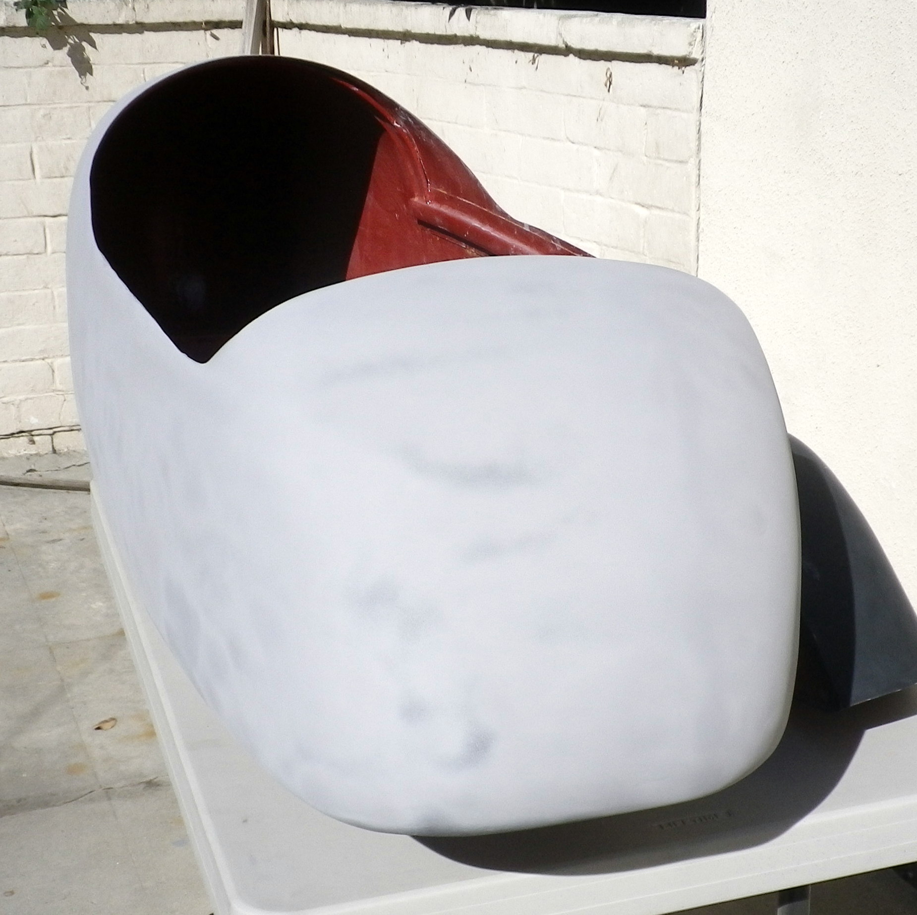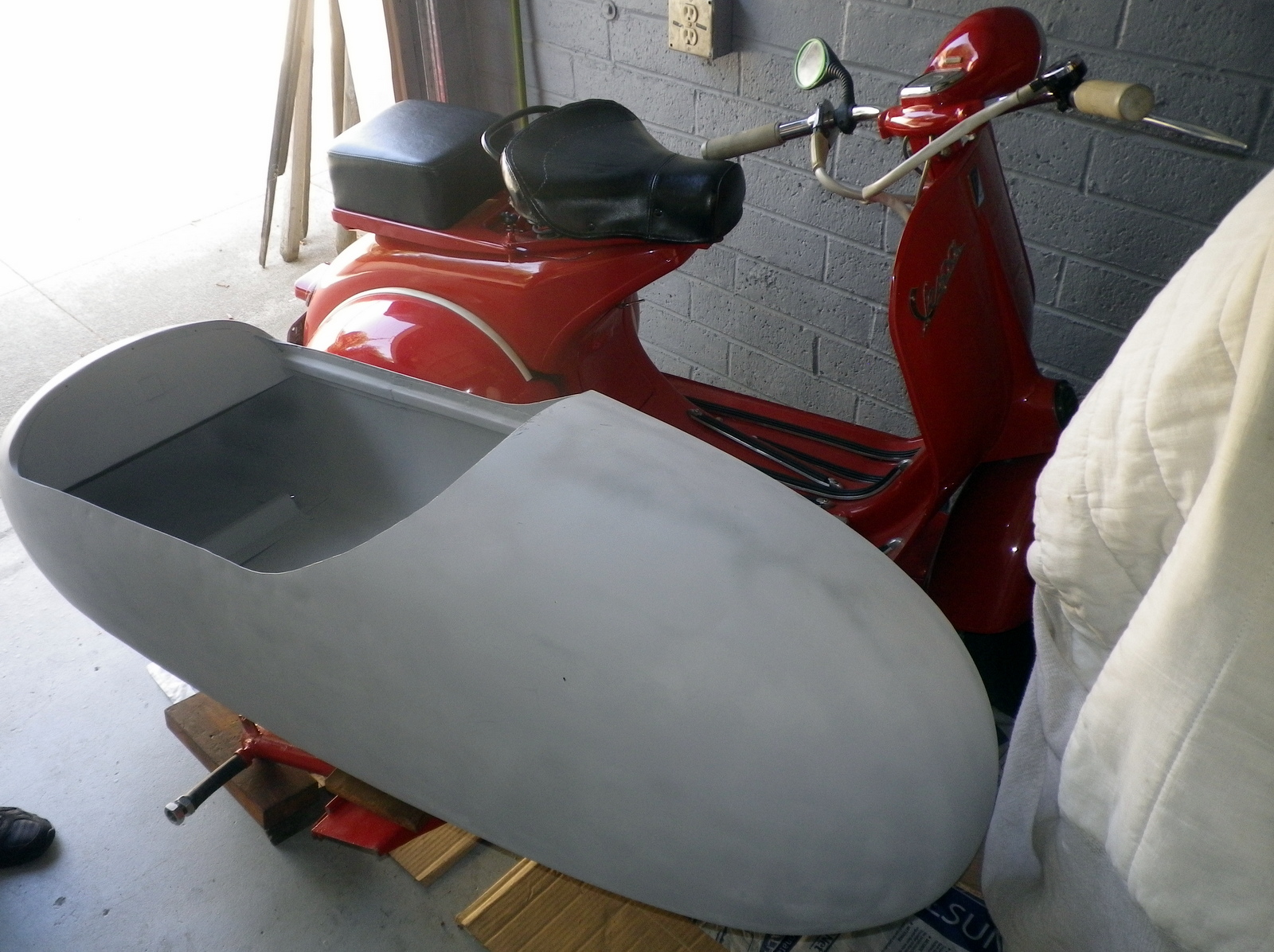 More progress, December 15, 2017! Further progress by Tim, January 11, 2018 "This week I made patterns for cutting metal. I cut and shaped metal for the floor of the tail, one side of the tail and one half of the floor. The floor is welded in place and still has to be metal finished after welding. This means that it has to be smoothed out where it was welded in. The pieces for the tail still have to be trimmed to fit and welded together and then welded to side car body and metal finished." January 18 update: January 26 update from Tim: "I did not put a lot of time on the sidecar this week, but it is coming together nicely. I trimmed the new pieces that I made and skip welded them on. Still have to do a solid weld and then hammer them out smooth, then the tail end will be finished, Then on to other smaller parts of the body." February 1, 2018 - approximately 90% complete! Great work by Tim! After many years of waiting for the sidecar, the end is in sight! Next stop - rust removal by L&M Stripping! As delivered on February 22 to L & M Stripping with its fender: After chemical de-rusting by L & M Stripping on February 27; then picked up by Tim Todd: The fender - after more work by Tim. Ready to be primed on March 29! The fender after one coat of Rust-Oleum auto primer, April 7 April 28, 2018, from Tim: "Have been working hard on the sidecar. I finished up the welding on the tail end and the floor. The floor is giving me a lot of problems. Can't get it very smooth. Trying to blend the new metal with the old is giving me a huge headache. I leaded over the rust holes on the left side and have it mostly filed out. I still have to add the extra support metal for the body bolt holes and a piece on the floor for the seat. Having a lot of trouble smoothing the body out. The old metal must have hardened with age and acid washing. Next week when I get all the parts attached, I will bring it over to you to look at and you can tell me how far you want me to go to try and smooth it out." The sidecar was delivered by Tim Todd on May 8, 2018; ready for priming and painting: In Burbank, May 8, 2018 May 10-12, 2018 - The sidecar interior was treated with "Fast-Etch" to prepare for prime coats. The first light prime coat went on the interior on May 12. Also, the sidecar axle threads were repaired by expert restorer and friend Jerry Miscevich. The new Timken bearings that came with the sidecar wheel (from Dan or Lake Havasu?) are not compatible with the partially threaded 3/4"axle. Bearing cups/races Timken #09195 have been pressed into the wheel, but replacements are needed for cones/bearings #09076 to fit the axle - to be purchased soon! Matching automotive color coat paint will also be acquired - red, of course! May 13, 2018 - Rust-Oleum automotive primer was used for the first prime coat; all of the interior and exterior is done except the bottom: May 14, 2018 - The bottom of the sidecar was primered; the sidecar was set loosely on the frame. The last photo shows the sidecar frame temporarily offset left, which puts the sidecar about 6" too close to Vespa body. The wheel is not yet on the axle. Not shown: Two Timken #09067 tapered roller bearings were purchased from Applied Industrial Technologies. Old red paint was removed from the axle and a "trial fit" confirmed these bearings fit the wheel and the axle. May 19, 2018 - The sidecar wheel was left at Master Auto Parts (Sun Valley) to match the Vespa red paint. Rick said the new paint would be put in spray cans and ready for pick up on May 21. May 21, 2018 - The color-matched red paint and the sidecar wheel were picked up from Master Auto Parts. Bearings were greased, set in the wheel and the wheel was installed on the axle. Photos below show another trial fit, with the sidecar located correctly on the frame. Sanding, filling, painting next! September 17, 2018: Under cover for 3 months when another project needed attention! Only visible progress is on the fender - the sidecar body had much sanding and filling, but progress is not obvious! November 12, 2018: Work on the sidecar resumed on November 8, after the 1980 Maserati Quattroporte was taken to a car show and I think it is now "sufficiently done". Good friend Jerry Miscevich took the fender home for expert attention. Photos below show it's ready for final red painting. Jerry advised me that further sidecar sanding and priming should be with with increasingly finer paper grits - 220, 320, 360 and 400. I wet-sanded it with 400 this date and it seems only a few small areas require further body putty filling and priming. Red paint next week? November 22, 2018: The photos below on Thanksgiving Day, show the sidecar and fender after more "prime, sand, prime, etc." stages. Next - the grey primer will be wet-sanded with 400 grit paper, then a dark grey prime coat will follow. Another wet-sanding should have it ready for color! December 1, 2018 - The sidecar interior and bottom have been painted with Rusto-Oleum "Sunset Red" and the body got two dark primer coats so that sanding would show up high and low spots. Just one more inspection and sanding before spraying the custom-mix red paint! Also, two long-missing original bearing/axle caps were found in the corner of our garage. These will improved the sidecar wheel appearance when de-rusted, painted and installed. December 8, 2018 - Just after the December 1 report, the sidecar was sprayed with a first coat of the custom-mixed red paint; further work was slightly delayed by two days of heavy rain. A second paint coat this day gave good results, as shown in the photos below. Inspection and any needed touch-ups next! December 25, 2018 - Work continued after the December 8 status. The custom-mixed paint was used up after the second coat. Two more spray cans and an extra pint were mixed by Master Auto Parts. On December 24, I did light sanding with 500 grit paper to get a smooth surface; coat #3 was applied to both the sidecar and the body. The frame was touched u