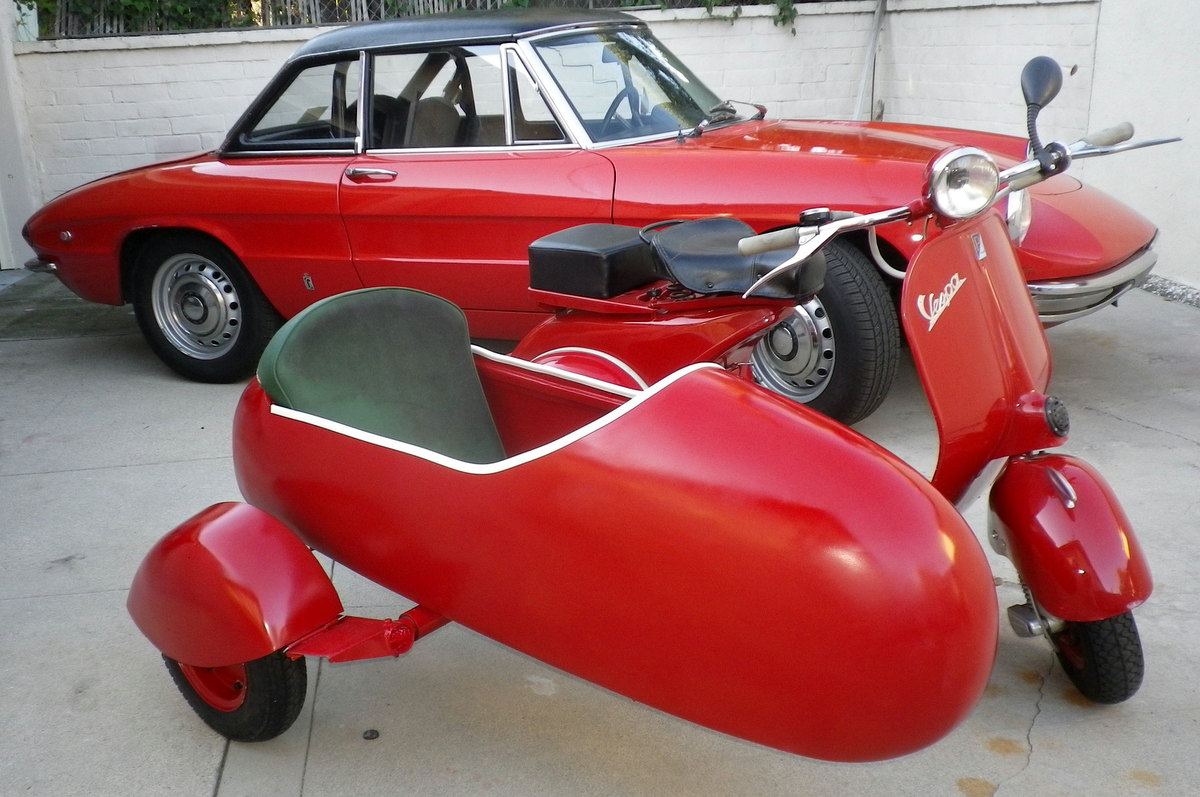 January 6, 2010 in Burbank And here's the Vespa in July 2010, with the new plates, next to my 1969 Alfa-Romeo. In April 2011, a side stand was installed on the Vespa - after 45 years, I no longer needed to prop it up with a wooden block!