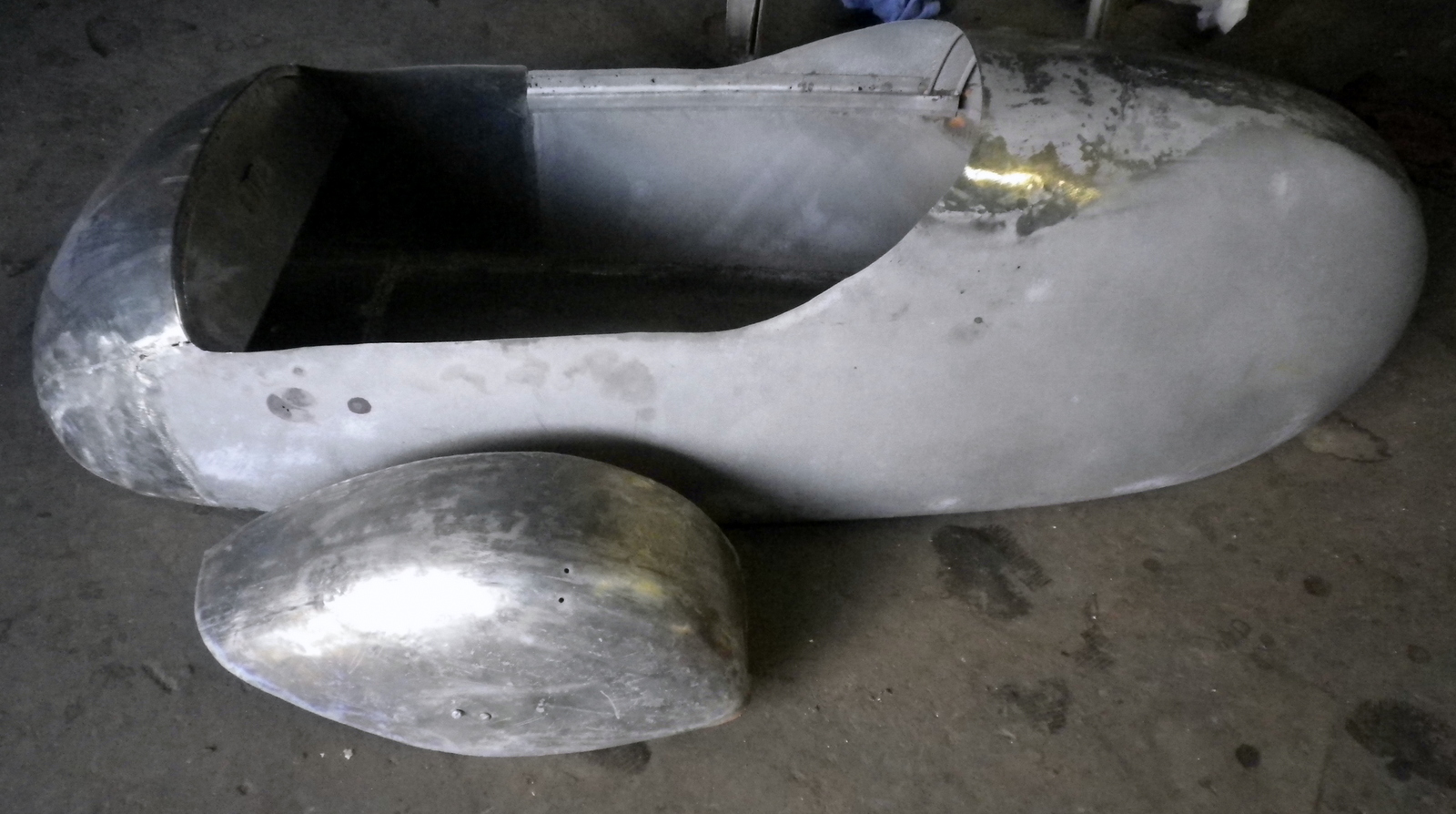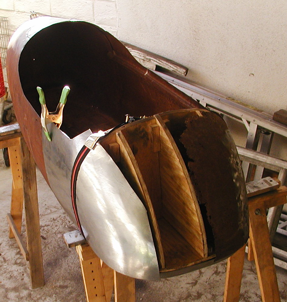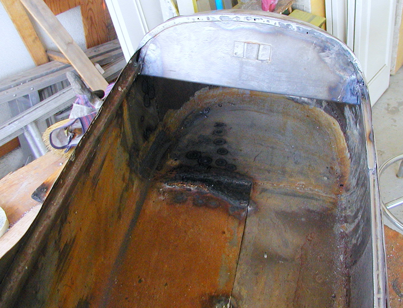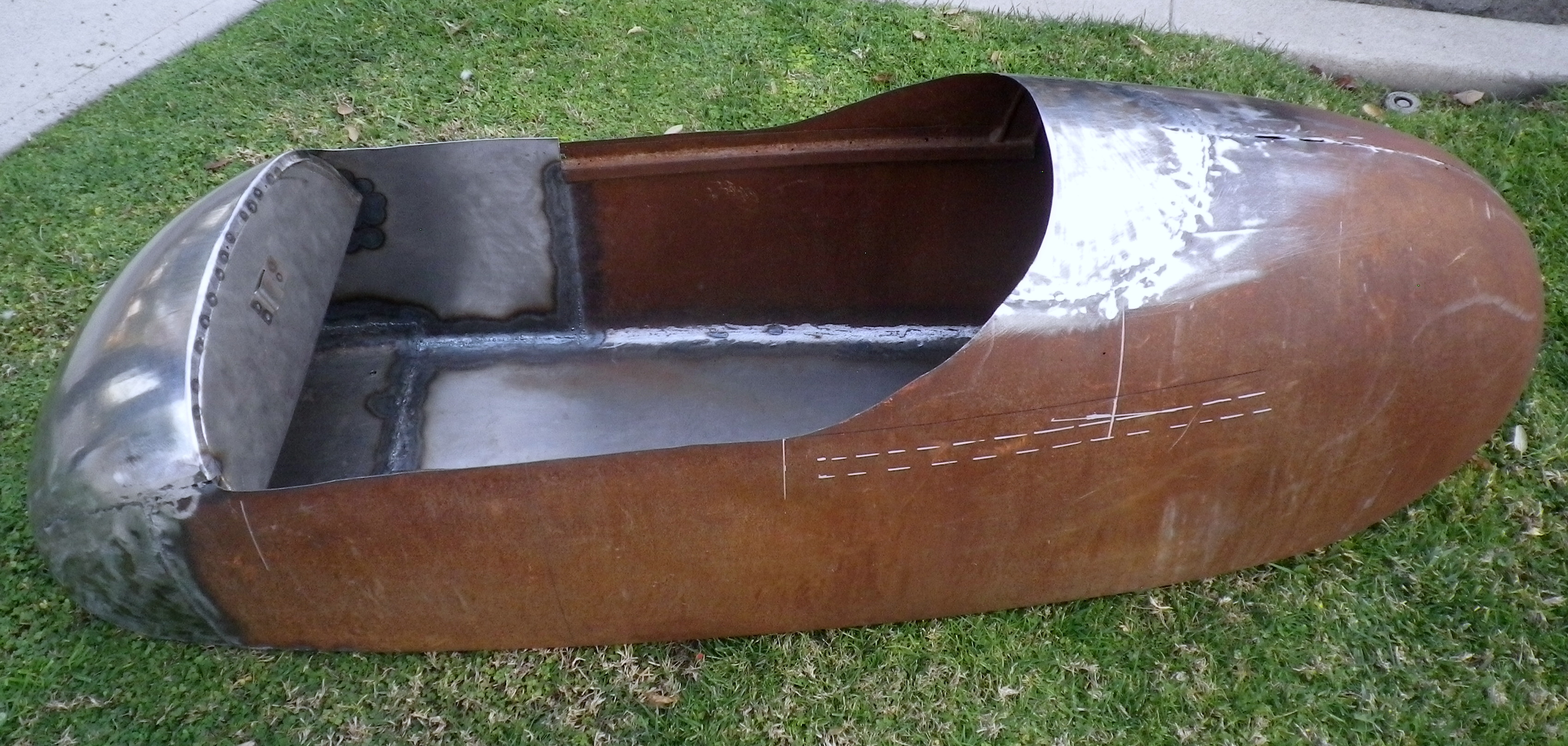 So what happened to the Allstate sidecar, left with Bruce Kimmins in Lake Havasu in August 1996? Years of promises and excuses to finish it! In January 2017, we rented a van to pick up the sidecar in Arizona. After calling Bruce from Palm Springs, he said the sidecar was not quite done, but he would meet us in Palm Springs and bring the sidecar frame and two Alfa body parts I had left with him many years previously. The frame, wheel and fender were on their way back to Burbank on January 23. Bruce promised to bring the sidecars to Burbank the next month, in February 2017. But that date came and went. Further promised September delivery dates also passed by. Because I strongly felt that 21 years was long enough to complete this project, on October 12, 2017 I emailed Bruce a weeks' notice that we would drive to Lake Havasu to get the sidecar(s). I again rented a van, drove directly to Bruce's shop in Lake Havasu on October 19 and picked up both sidecars. The aluminum replica was about 80-90% complete. The aluminum replica sidecar, retrieved from Lake Havasu City, AZ My rusty Allstate Cruisaire sidecar, October 2017 Packard restorer and builder Jerry Misc evich introduced me to Tim Todd, the metal worker who fabricated a steel body for Jerry's 1929 Packard Speedster. Jerry's great car was featured on Jay's Leno's Garage. Tim looked at both sidecars and agreed the Allstate sidecar could be saved. Tim took it to his shop on December 4, 2017 and within a few days had built patterns to shape the very rusty rear part of the sidecar.