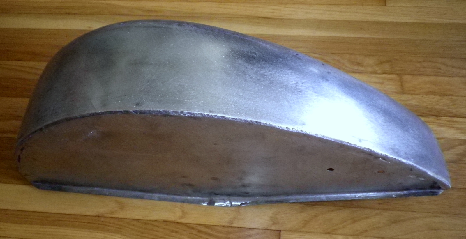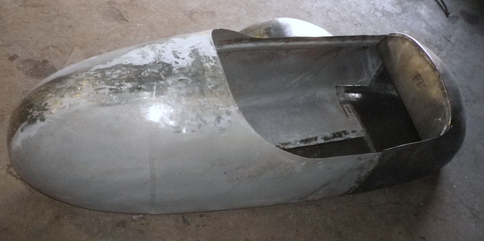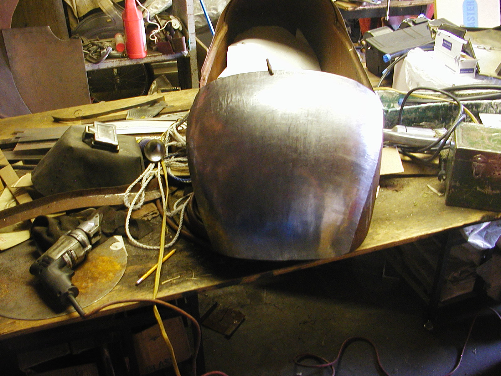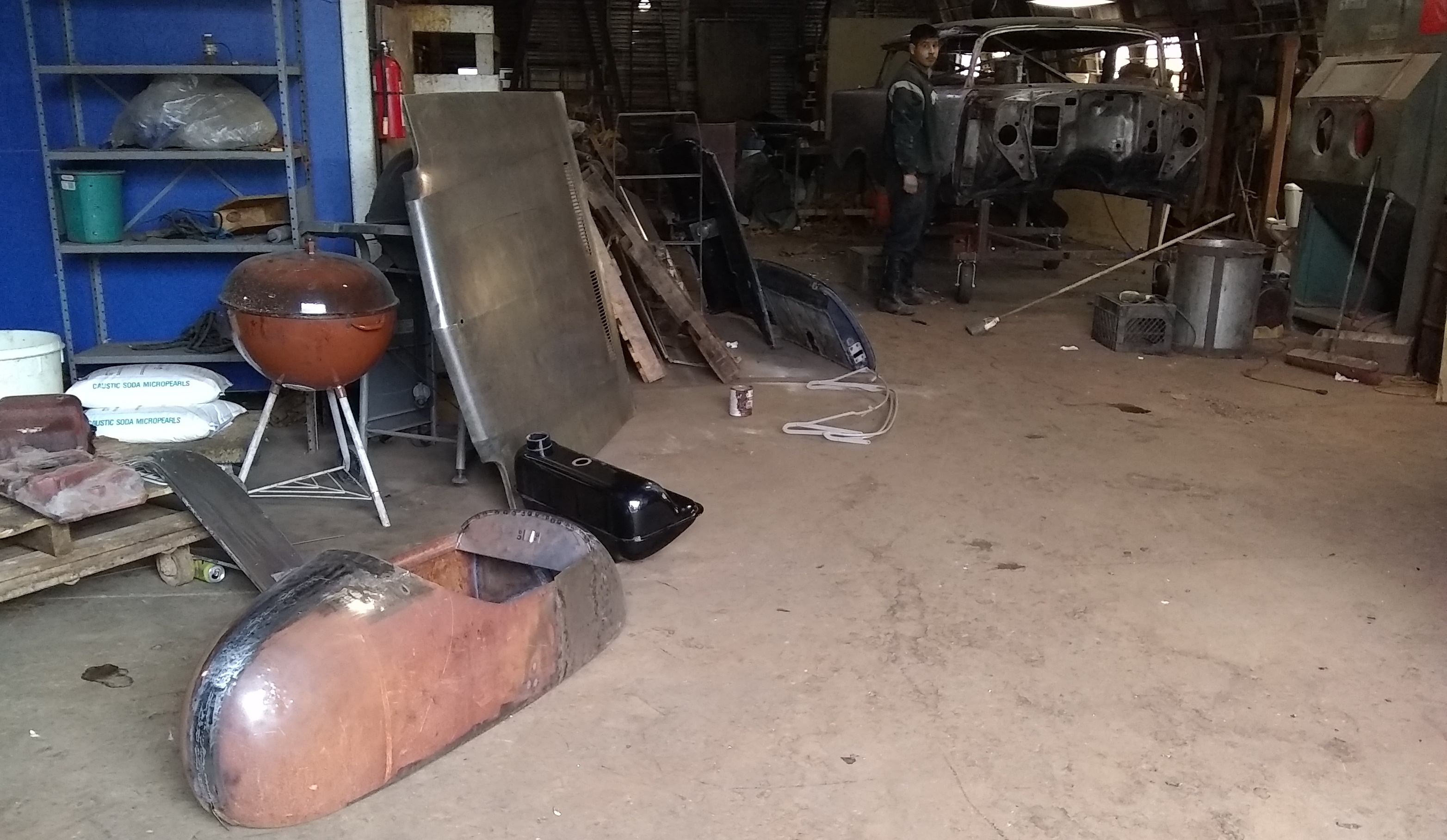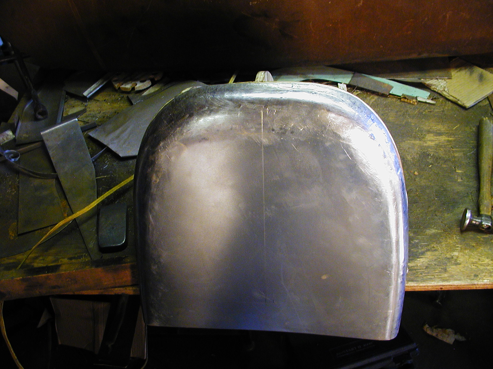 So what happened to the Allstate sidecar, left with Bruce Kimmins in Lake Havasu in August 1996? Years of promises and excuses to finish it! In January 2017, we rented a van to pick up the sidecar in Arizona. After calling Bruce from Palm Springs, he said the sidecar was not quite done, but he would meet us in Palm Springs and bring the sidecar frame and two Alfa body parts I had left with him many years previously. The frame, wheel and fender were on their way back to Burbank on January 23. Bruce promised to bring the sidecars to Burbank the next month, in February 2017. But that date came and went. Further promised September delivery dates also passed by. Because I strongly felt that 21 years was long enough to complete this project, on October 12, 2017 I emailed Bruce a weeks' notice that we would drive to Lake Havasu to get the sidecar(s). I again rented a van, drove directly to Bruce's shop in Lake Havasu on October 19 and picked up both sidecars. The aluminum replica was about 80-90% complete. The aluminum replica sidecar, retrieved from Lake Havasu City, AZ My rusty Allstate Cruisaire sidecar, October 2017 Packard restorer and builder Jerry Misc evich introduced me to Tim Todd, the metal worker who fabricated a steel body for Jerry's 1929 Packard Speedster. Jerry's great car was featured on Jay's Leno's Garage. Tim looked at both sidecars and agreed the Allstate sidecar could be saved. Tim took it to his shop on December 4, 2017 and within a few days had built patterns to shape the very rusty rear part of the sidecar.