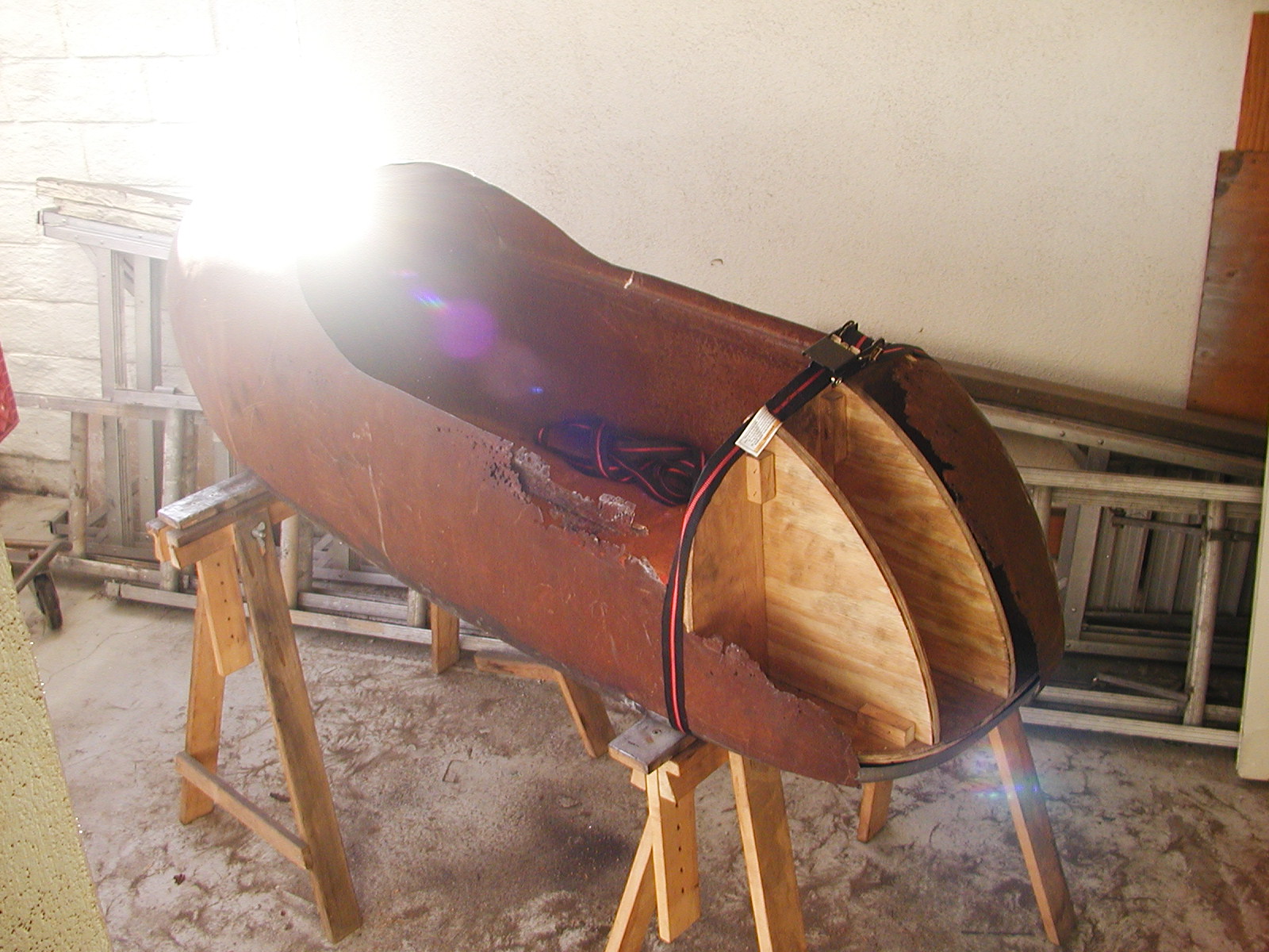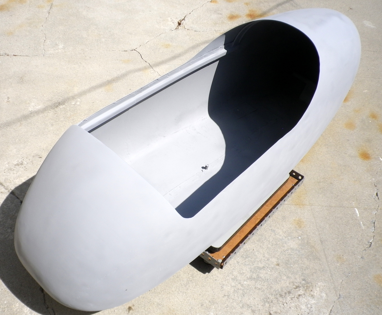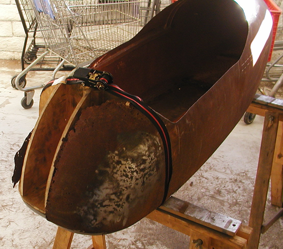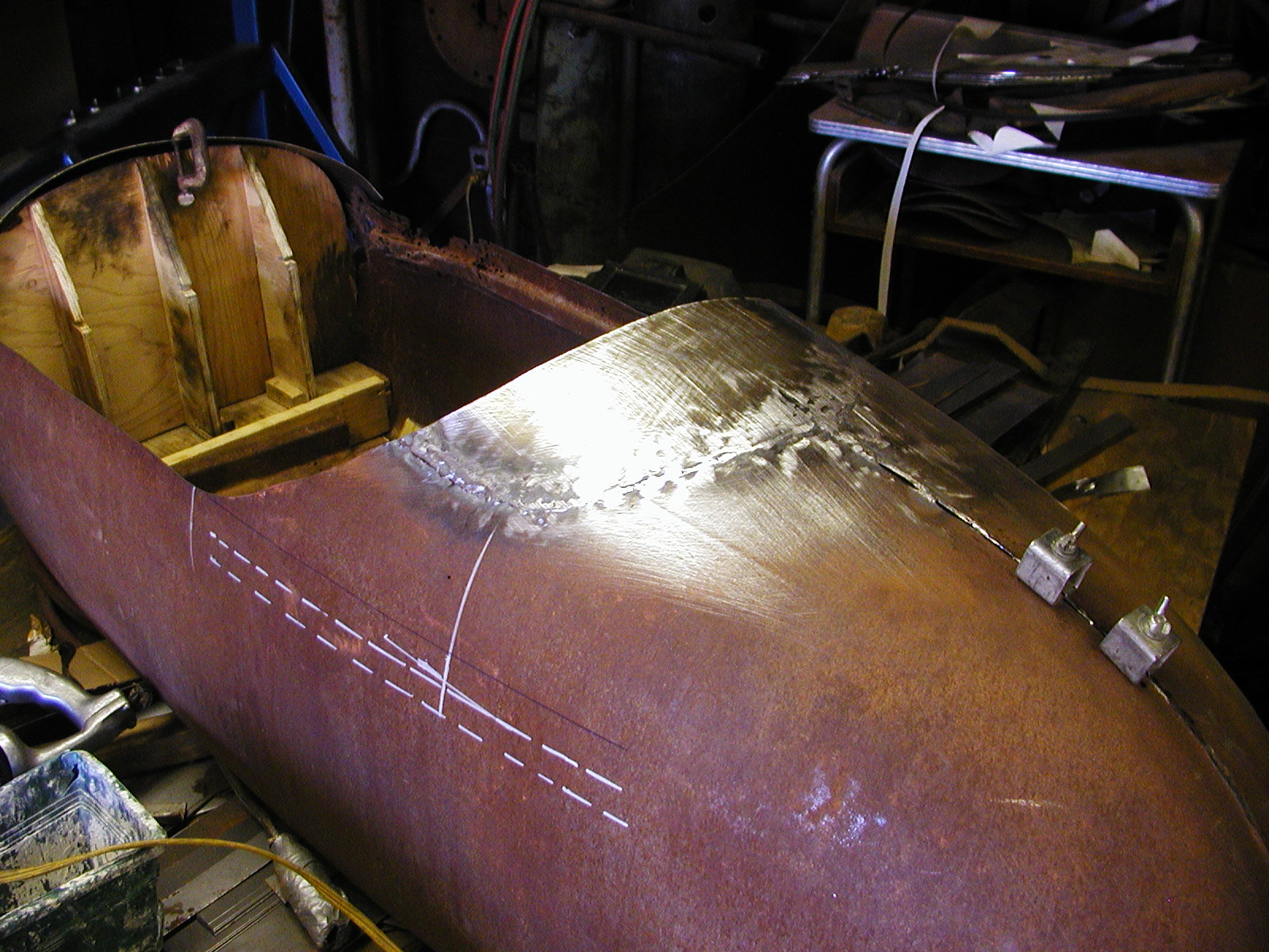 So what happened to the Allstate sidecar, left with Bruce Kimmins in Lake Havasu in August 1996? Years of promises and excuses to finish it! In January 2017, we rented a van to pick up the sidecar in Arizona. After calling Bruce from Palm Springs, he said the sidecar was not quite done, but he would meet us in Palm Springs and bring the sidecar frame and two Alfa body parts I had left with him many years previously. The frame, wheel and fender were on their way back to Burbank on January 23. Bruce promised to bring the sidecars to Burbank the next month, in February 2017. But that date came and went. Further promised September delivery dates also passed by. Because I strongly felt that 21 years was long enough to complete this project, on October 12, 2017 I emailed Bruce a weeks' notice that we would drive to Lake Havasu to get the sidecar(s). I again rented a van, drove directly to Bruce's shop in Lake Havasu on October 19 and picked up both sidecars. The aluminum replica was about 80-90% complete. The aluminum replica sidecar, retrieved from Lake Havasu City, AZ My rusty Allstate Cruisaire sidecar, October 2017 Packard restorer and builder Jerry Misc evich introduced me to Tim Todd, the metal worker who fabricated a steel body for Jerry's 1929 Packard Speedster. Jerry's great car was featured on Jay's Leno's Garage. Tim looked at both sidecars and agreed the Allstate sidecar could be saved. Tim took it to his shop on December 4, 2017 and within a few days had built patterns to shape the very rusty rear part of the sidecar.